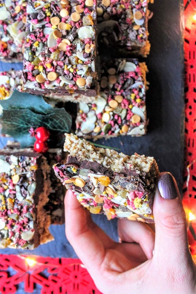 With a base made from oats, nuts and mixed spice for that festive touch, a raw chocolate topping is finished off with a mixture of dried fruits, seeds and other goodies to make each bite look (almost!) too beautiful to eat and certainly more like a special treat to indulge in! What’s better is that these are dairy-free, gluten-free, vegan (just leave out the bee pollen) and contain no refined sugar – but plenty of taste! Enjoy 🙂
