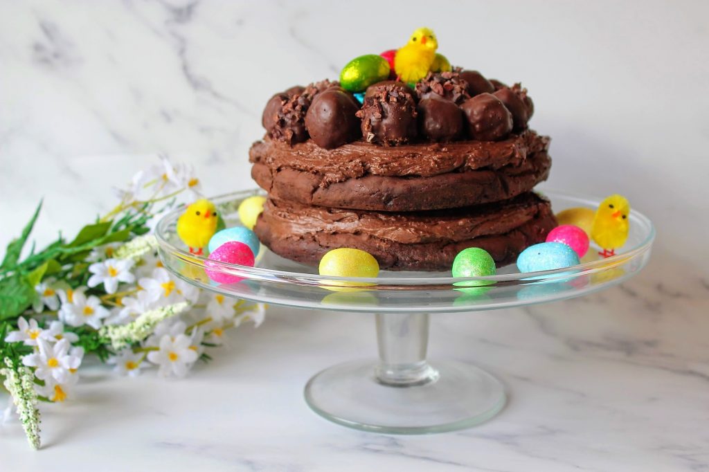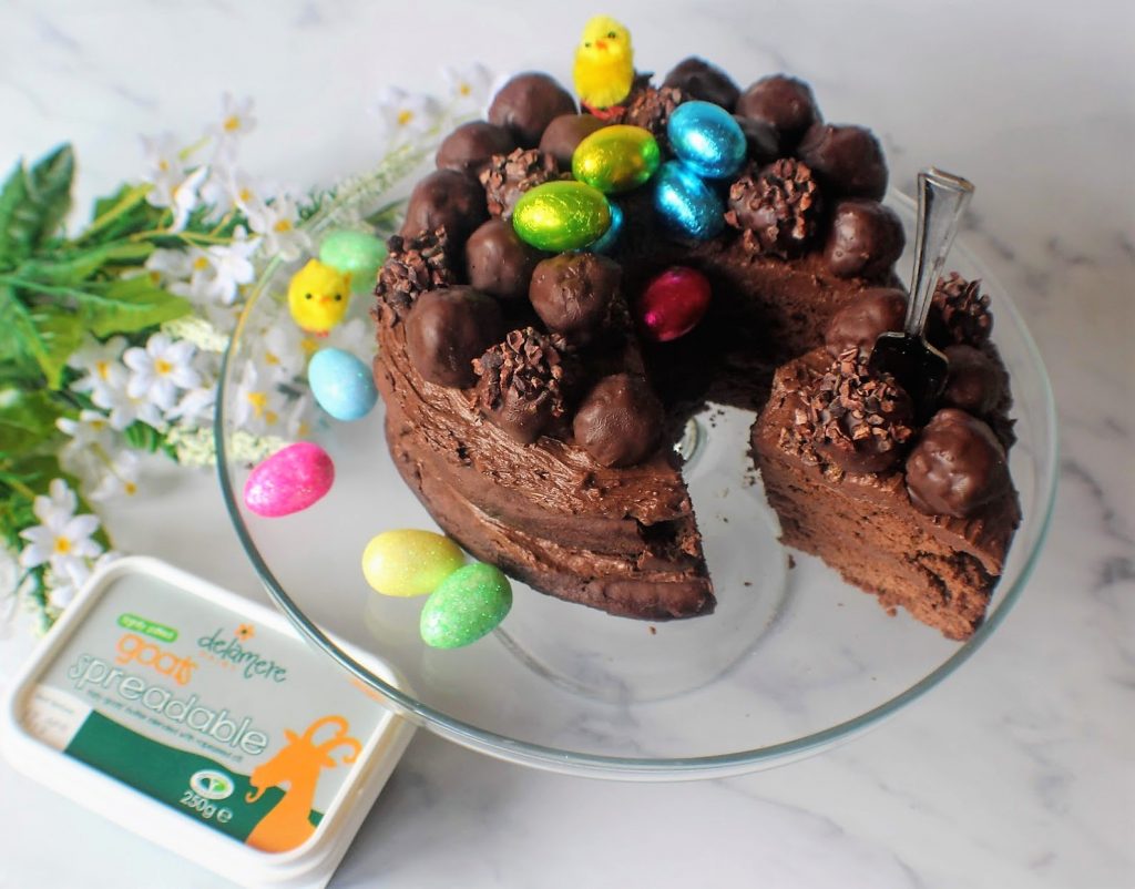 In collaboration with Delamere Dairy, who I’ve worked with before on a festive and healthy breakfast recipe, this time I’m bringing you a wonderful, rich and indulgent bake in time for this celebration. The chocolate cake uses the spreadable goats butter which makes a really light sponge, while the block butter (once softened) works amazingly for a creamy frosting to sandwich the cake together and smothered across the top – the perfect setting for a decorative Easter touch.