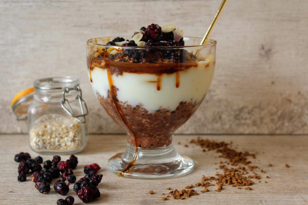 - Place the oats, cocoa powder, chia seeds, cinnamon and protein powder (if using) into a bowl or kilner jar and mix well. Pour in the milk, coffee syrup or honey and vanilla and stir well.