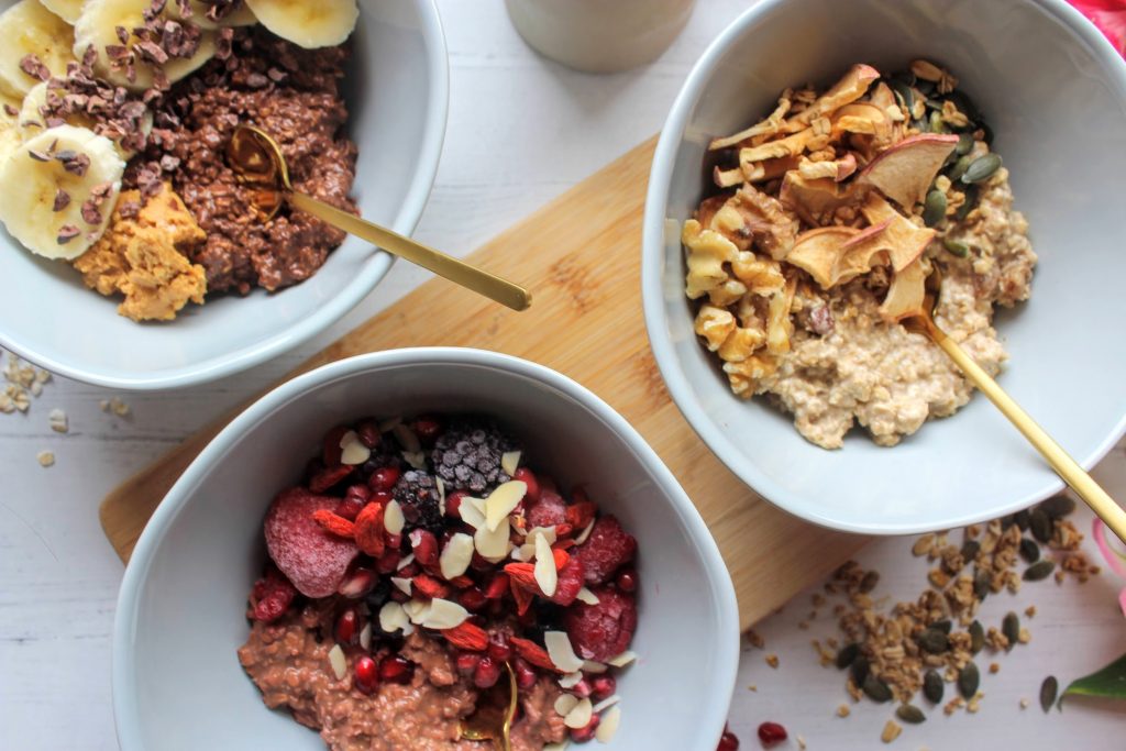 1. The night before, mix the overnight oat ingredients together in three separate Sophie Conran for Portmeirion bowls and place them in the fridge.