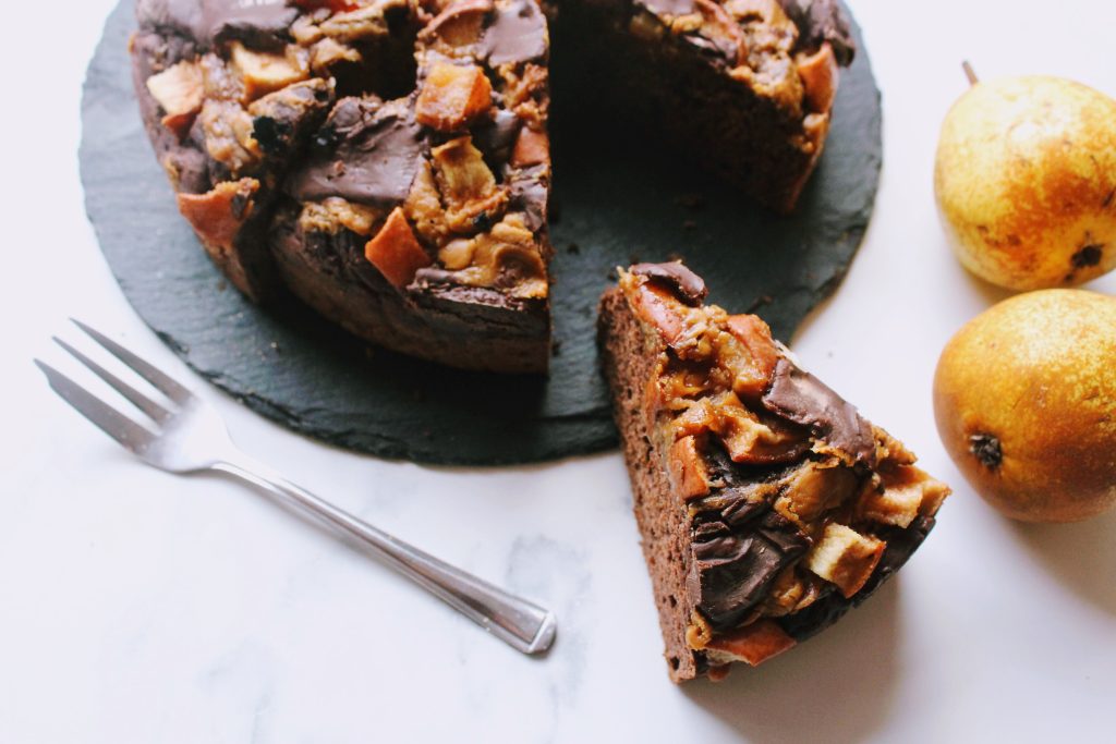 Say hello to this absolute winner of a combination for a cake: A rich, indulgent brownie topped with juicy pears and sticky caramel glaze…Wow! Working in collaboration with Nature’s Charm using their incredible (and dangerously addictive) vegan caramel coconut sauce, this recipe would be perfect for a special celebration, a weekend bake, or even just for a midweek treat! Apples would work just as well as pears, and extra nuts sprinkled on top towards the end of baking would add an even more delicious crunch!