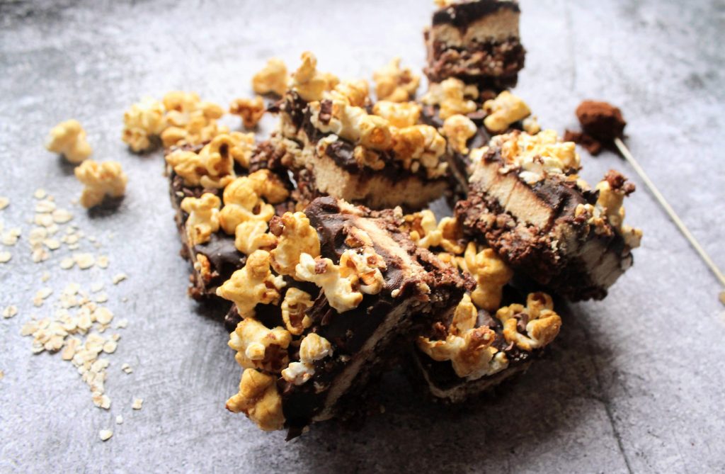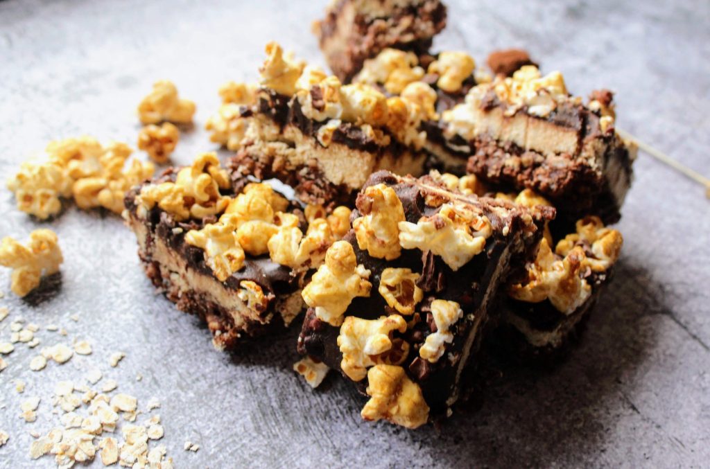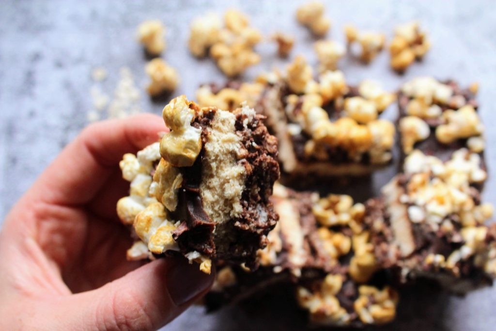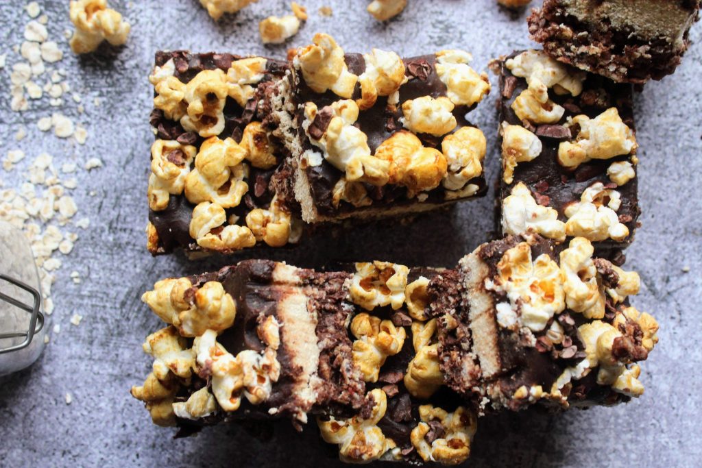 These snack bars have layers of a chocolate crispy base, a cookie dough middle and a topping of chocolate and salted caramel popcorn – the perfect combo for a plant-powered boost! For an extra chocolate hit, add in dark chocolate chips to the cookie dough layer, or even chopped white chocolate on the top layer! Wowza.