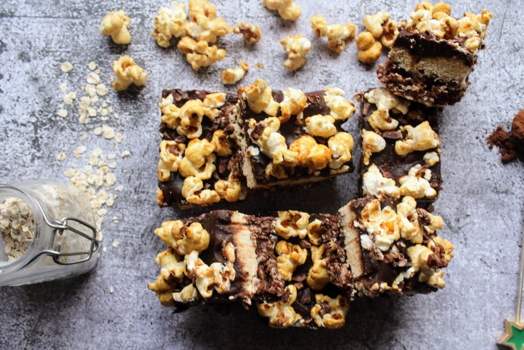 - Melt the coconut oil and chocolate then pour over to cover. Sprinkle over the popcorn and cacao nibs and press down gently.
