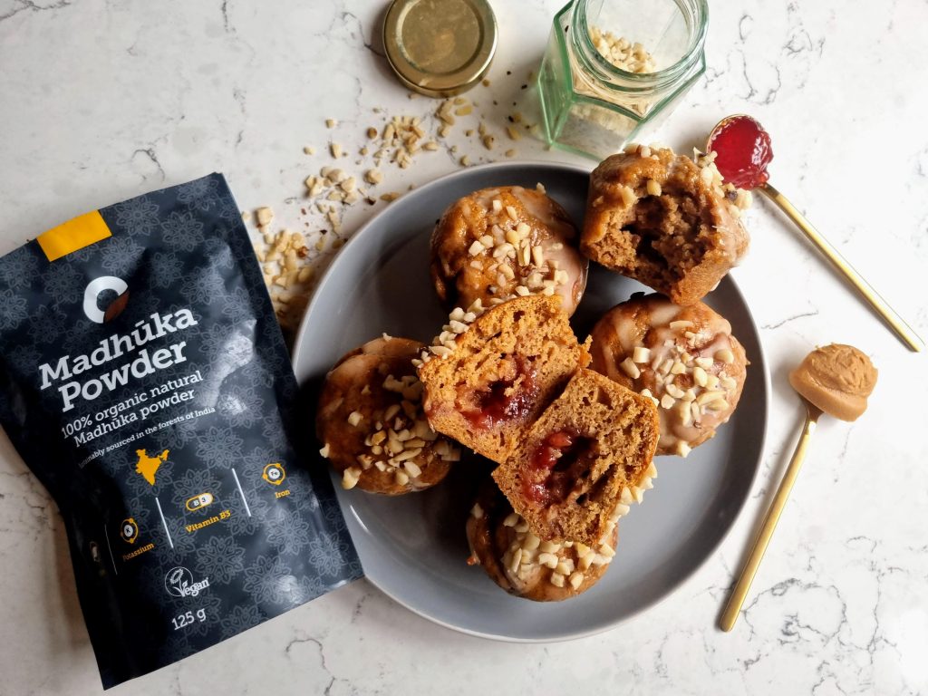 Ooooh, caramel-like spongey muffins with a hint of peanut butter, a generous dollop of jam in the middle and topped with crunchy nuts…Say hello to these insanely delicious treats! Using Madhuka powder, a natural sweetener with a beautiful hint of caramel flavour, really lifts the flavour in this easy recipe. You really can’t beat a PB&J combo!
