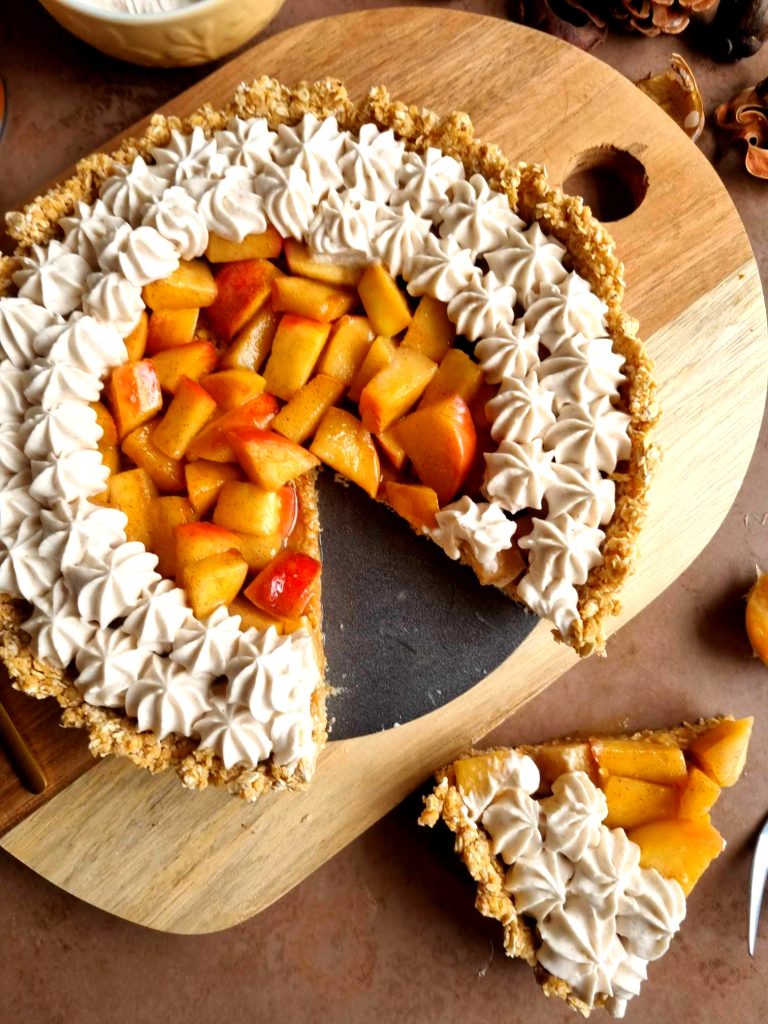 - Spoon the cooled apple mixture into the tart case to cover the base generously. Then spoon the whipped oat cream into a piping bag and pipe around the edges a couple of times.