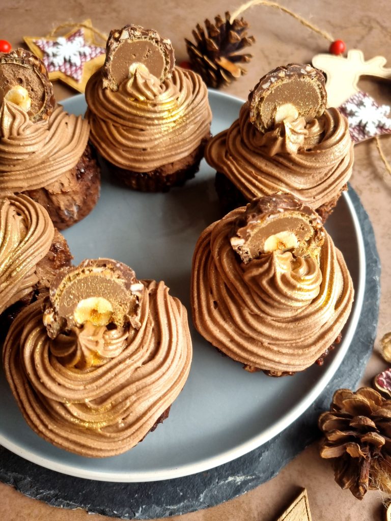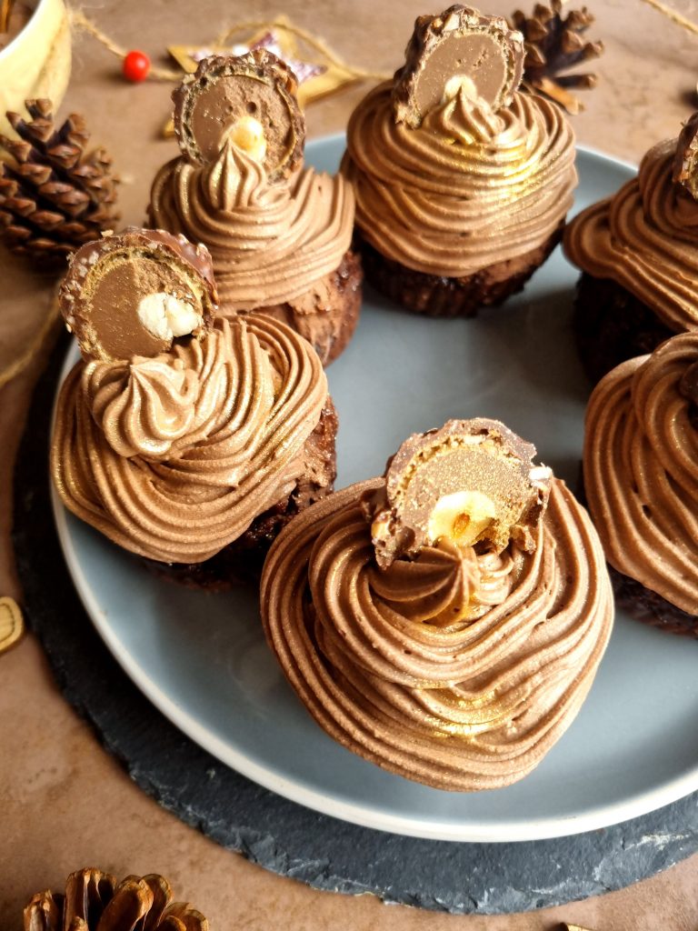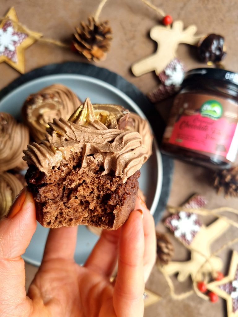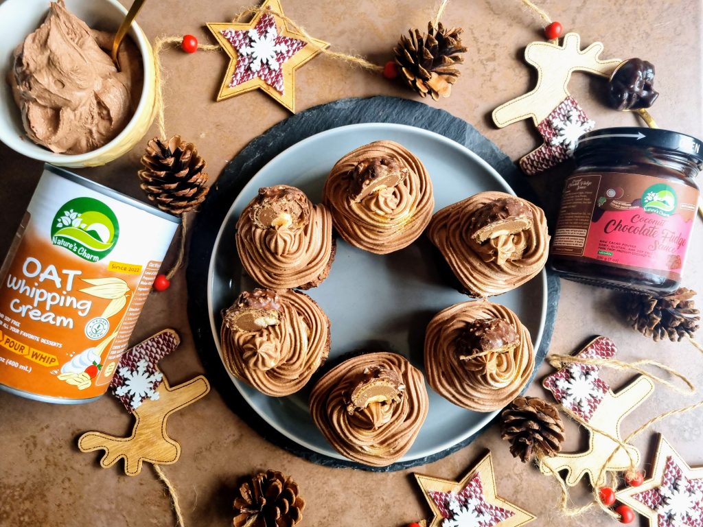 I am so thrilled with these insanely decadent chocolate fudge muffins…topped with the creamiest oat whipping cream and vegan-friendly Ferrero Rochers as the ‘icing on the cake’! A plant based recipe using Nature’s Charm [paid recipe] delicious oat whipping cream and chocolate fudge sauce, these ingredients make these festive treats such a gorgeous recipe to bake over the season.
