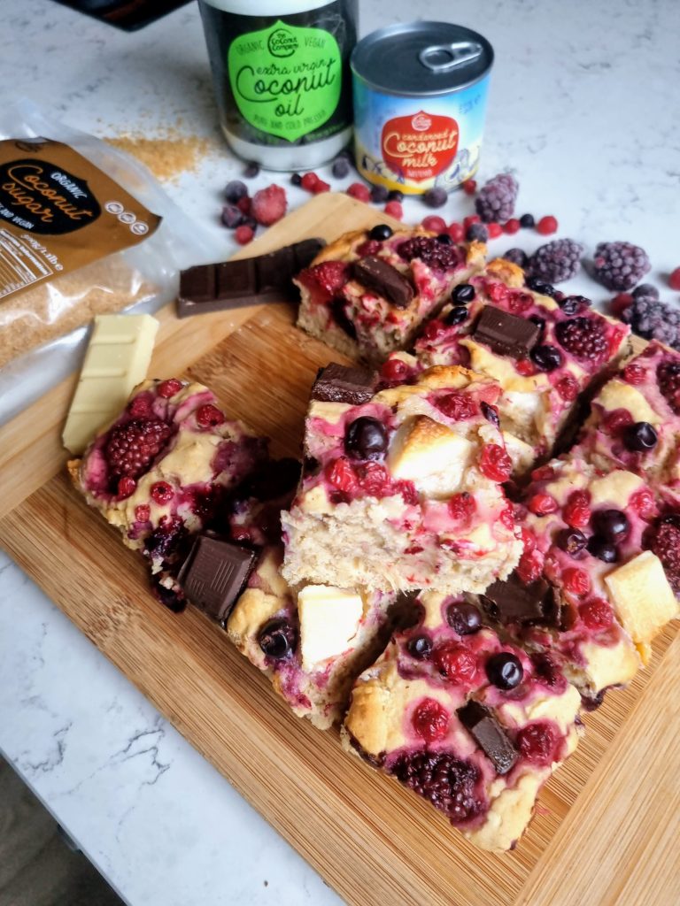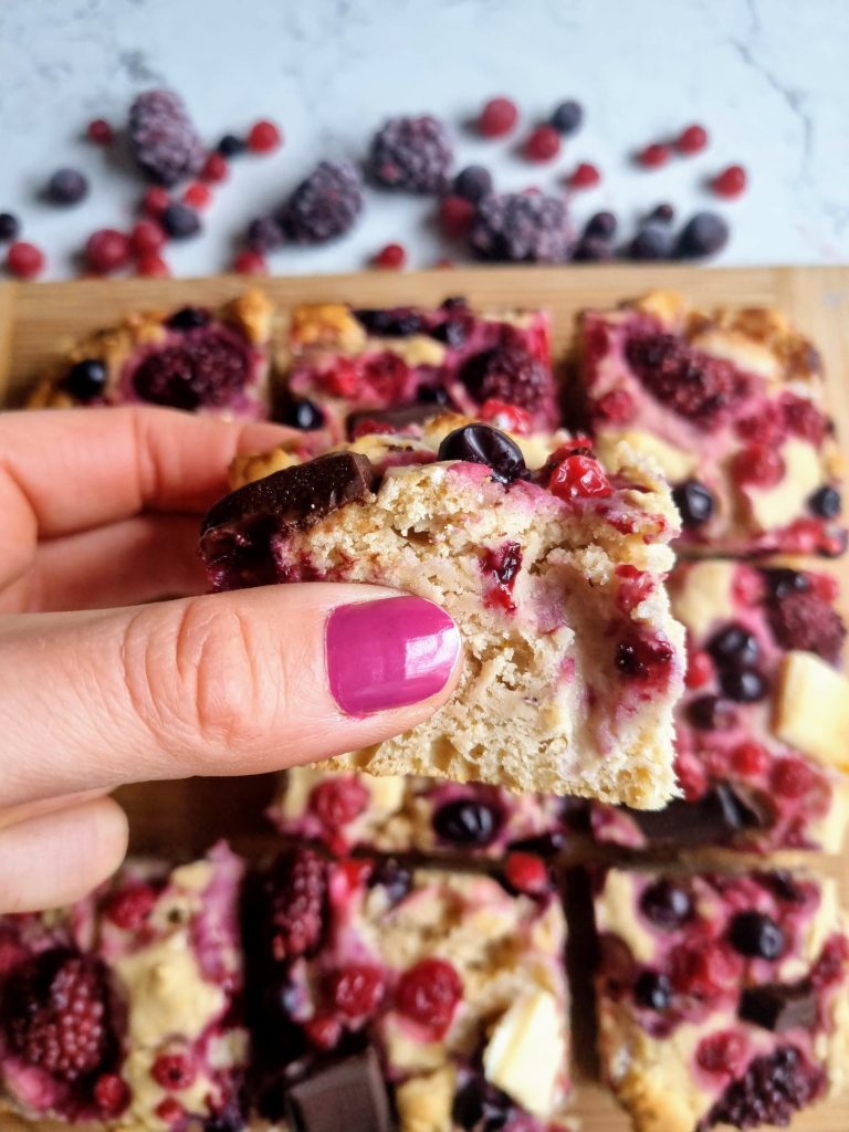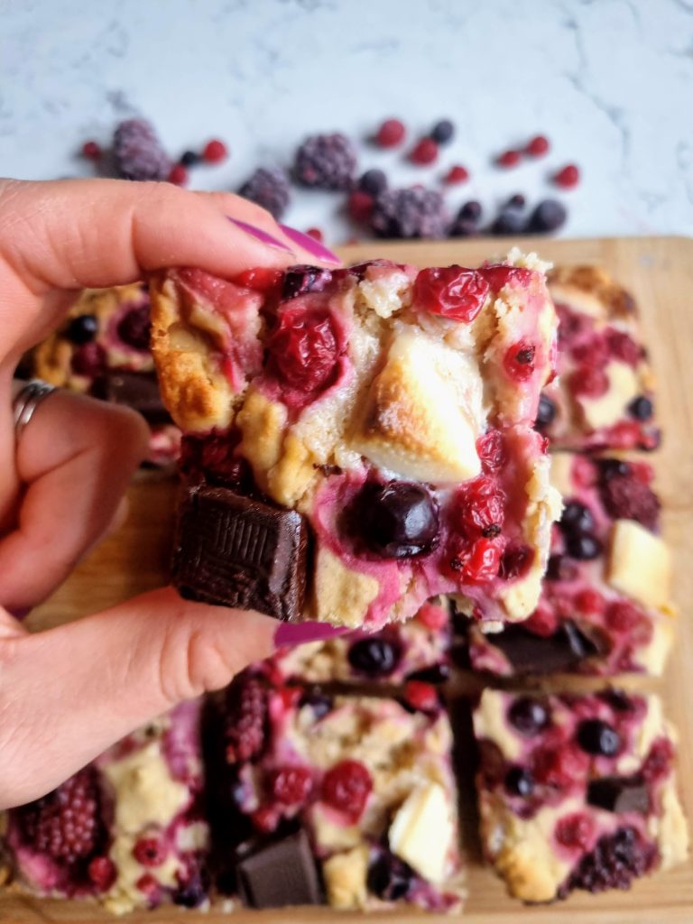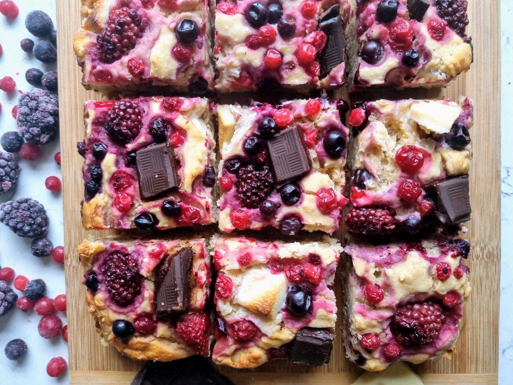- Spoon into a greased and lined 9x9in baking tin then scatter over the berries and chocolate chunks, gently pressing in.