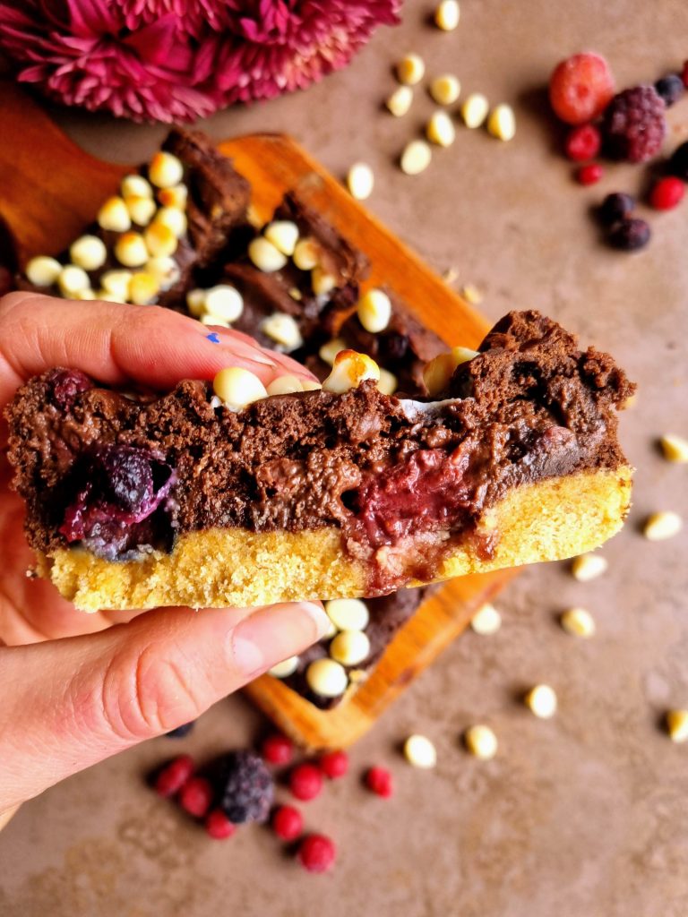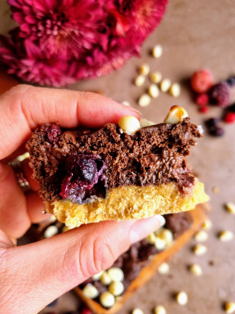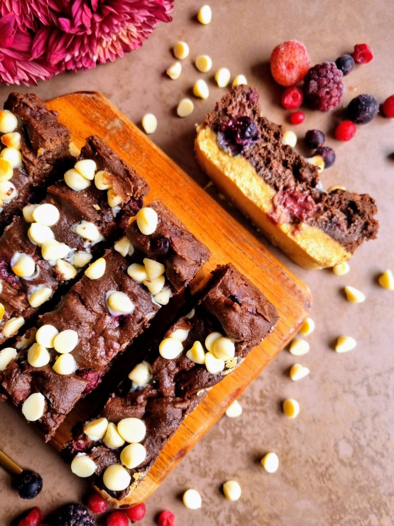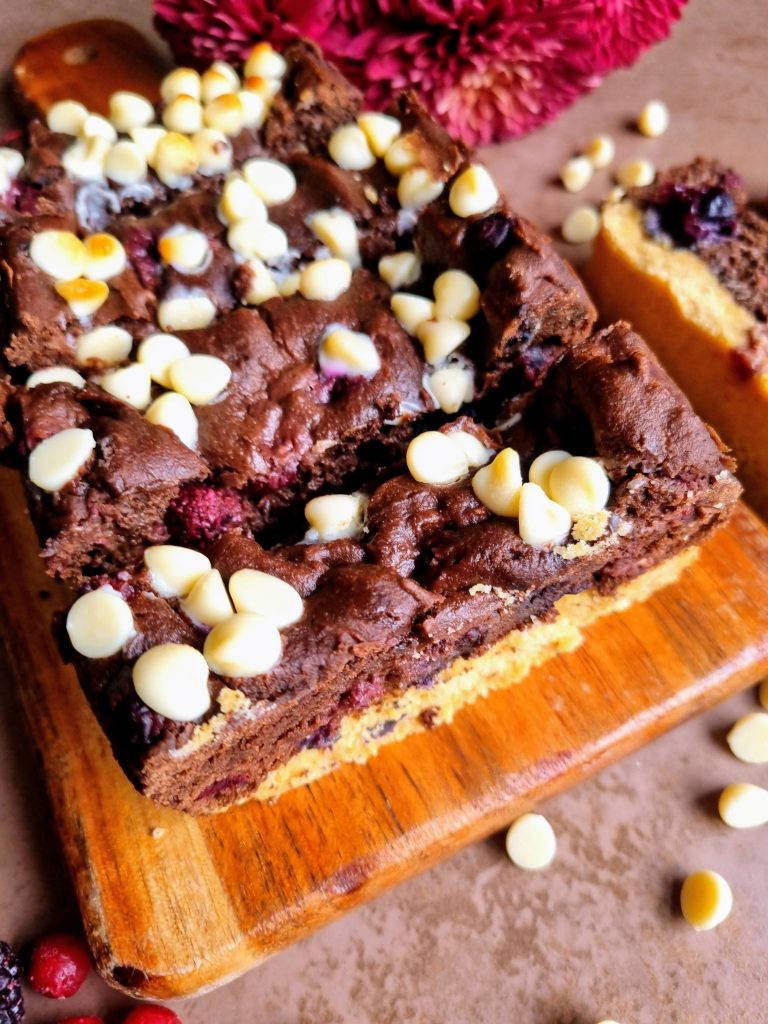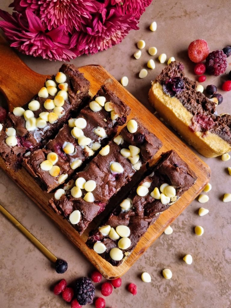 This might sound like a bit of a random mix of things and flavours but trust me, this combination works SO well! A biscuity gingerbread inspired base, topped with a berry studded brownie plus white chocolate chips scattered on top…Seriously good and such an ideal mid morning or mid afternoon sweet snack.