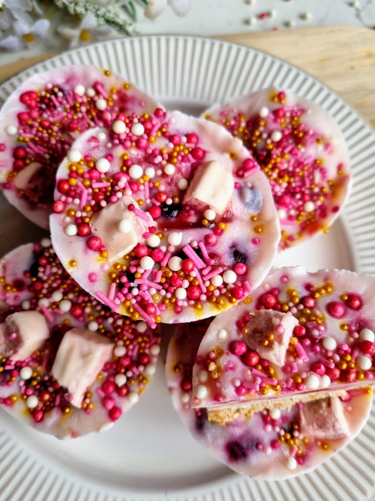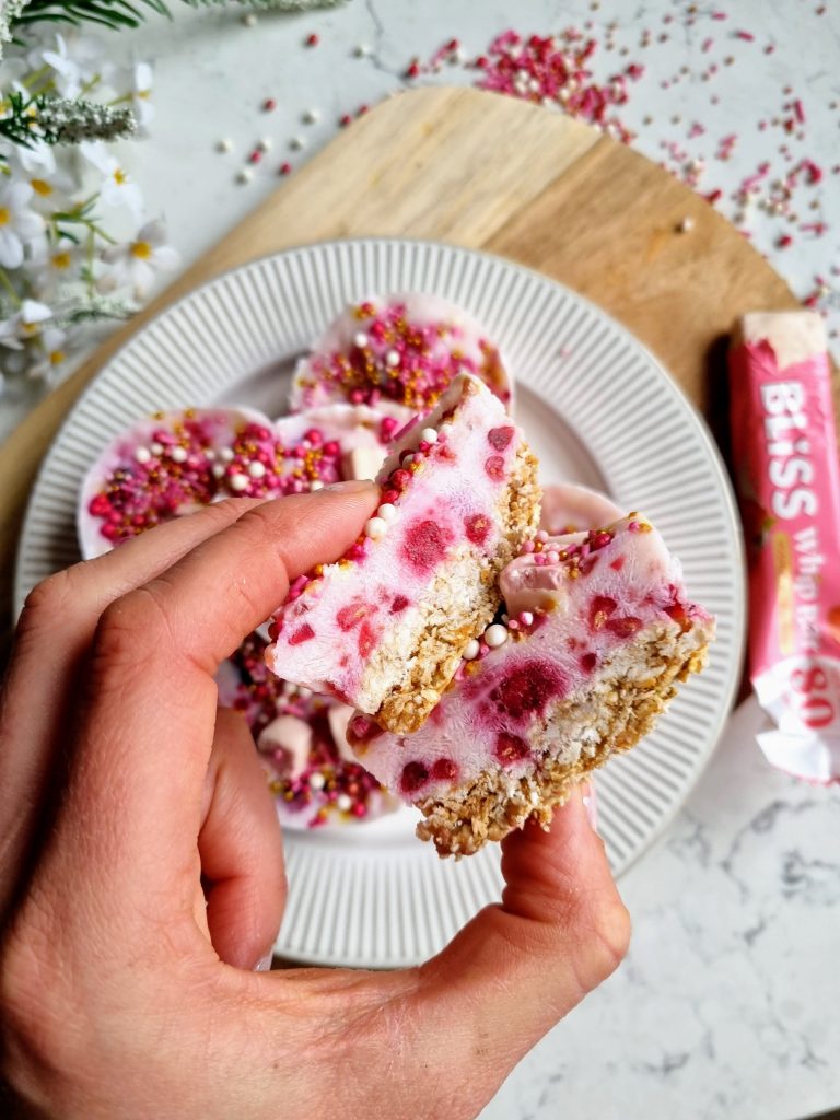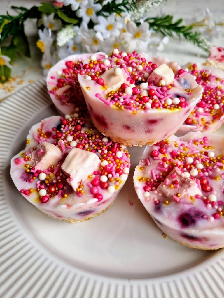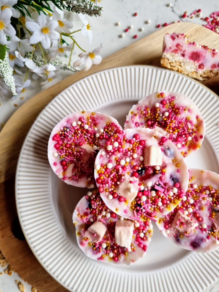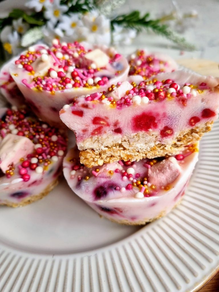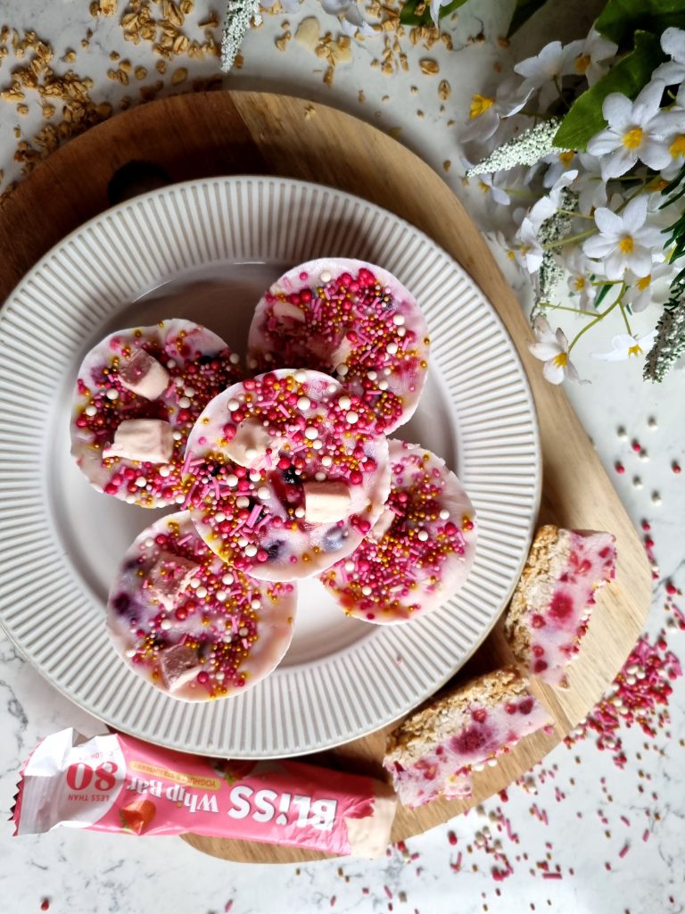 - Place a few chunks of the Bliss bar on top then add some pink sprinkles on top. Freeze for at least 2 hours, then pop out of the freezer and enjoy!