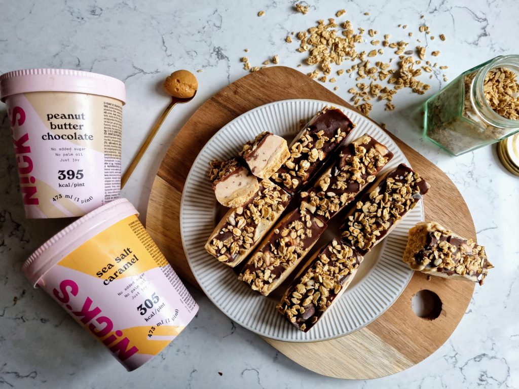 - Allow the ice cream to defrost a little (remove from the freezer 10 minutes beforehand) then scoop out and smooth over each base (4 x salted caramel, 4 x peanut butter chocolate) to nearly reach the top of each. Place in the freezer.