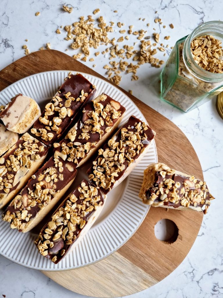 - Meanwhile melt the chocolate and coconut oil then spoon over each to cover. Sprinkle over granola then place back in the freezer for at least 1 hour.