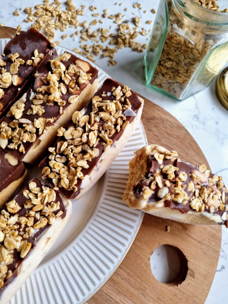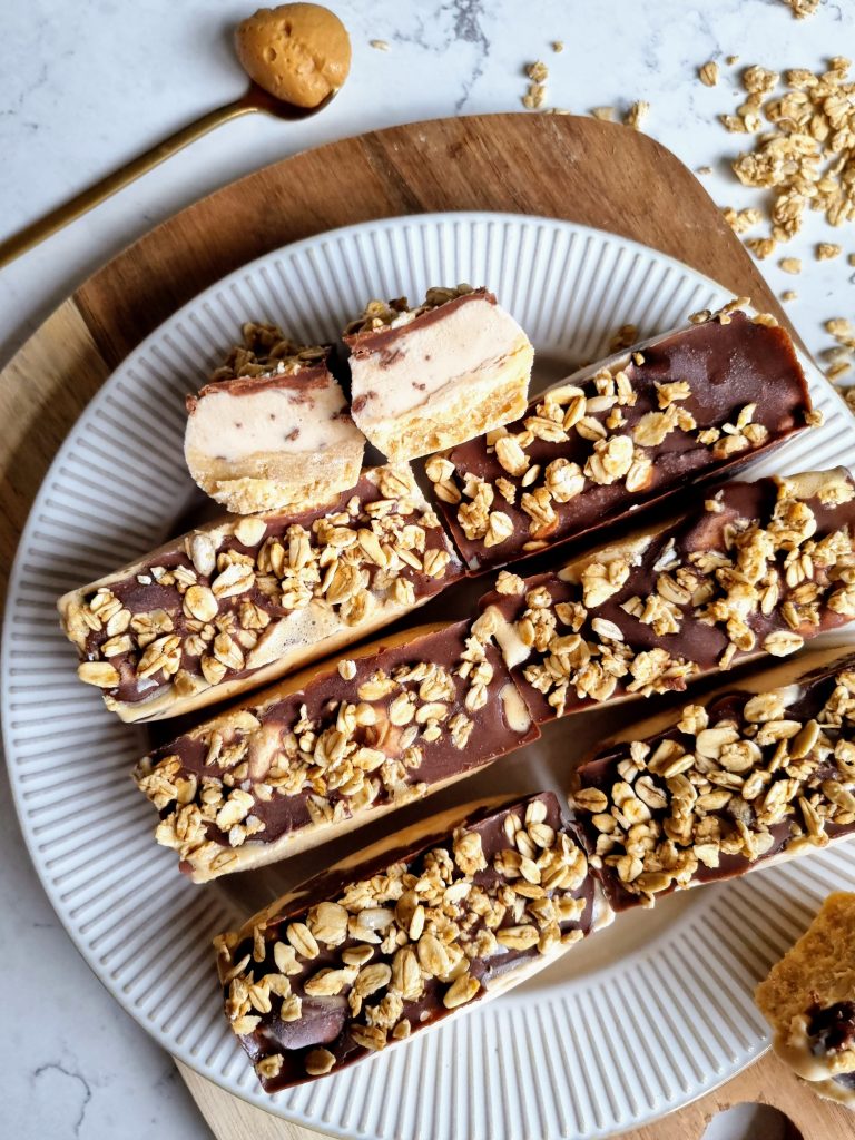 It might not be summer yet but it’s never too early for a frozen treat, especially when we’re talking about this recipe which combines peanut butter + chocolate into these high protein, sweet tooth satisfying bars. No need to bake and easy to whizz up and pop in the freezer for whenever you hit a craving!