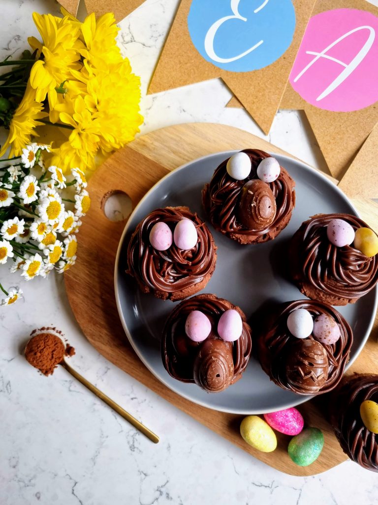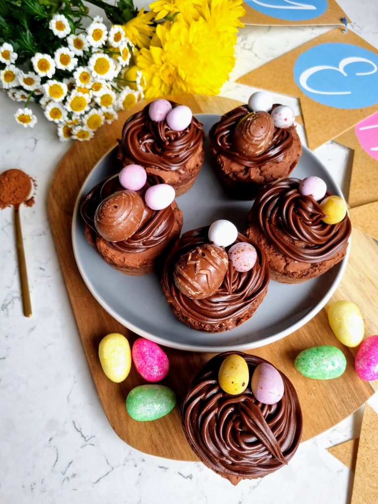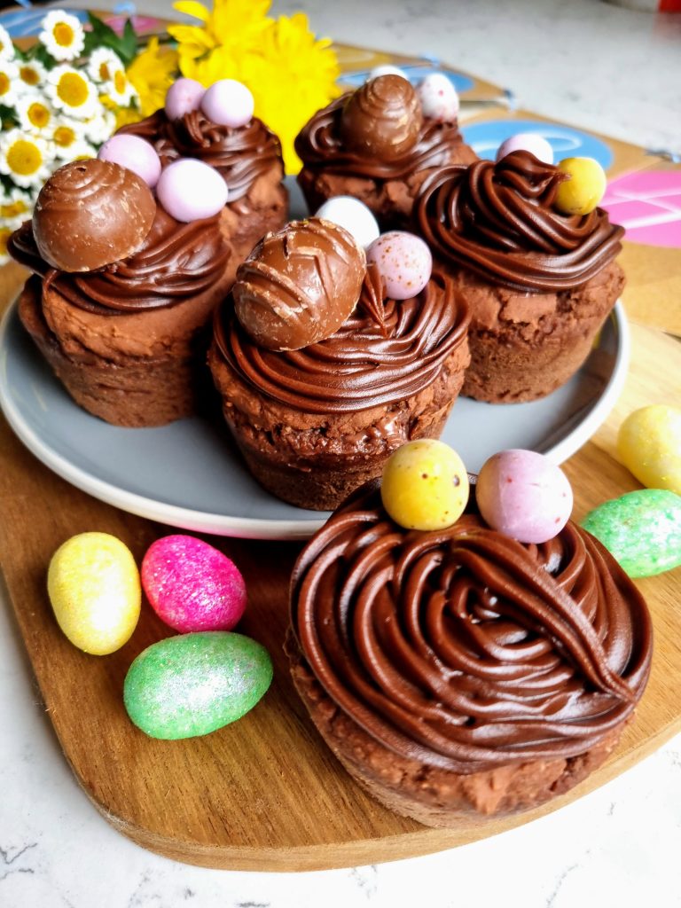 Oh hey there super delicious, indulgent and decadent Easter treats – or to be honest, for any time after Easter if you have any leftover chocolate or Mini Eggs to use up. An easy gluten-free cupcake recipe topped with a chocolate ganache and finished off with extra chocolatey toppings…get these baking and enjoy!