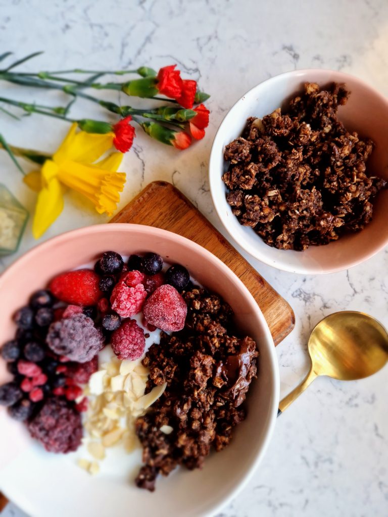 There’s something so satisfying about making your own granola – especially when you can make it under 15 minutes in an air fryer (not having to preheat the oven, winner!). This recipe is a delicious, simple and healthy combination of oats, nut butter, chocolate and banana to create a batch of chunky goodness that can be enjoyed at any time of day. You can double the batch if you want, and keep in an airtight container. Mix up how you serve it; from enjoying with fruit and yogurt to sprinkling on top of a protein pudding, or just straight from the tub!