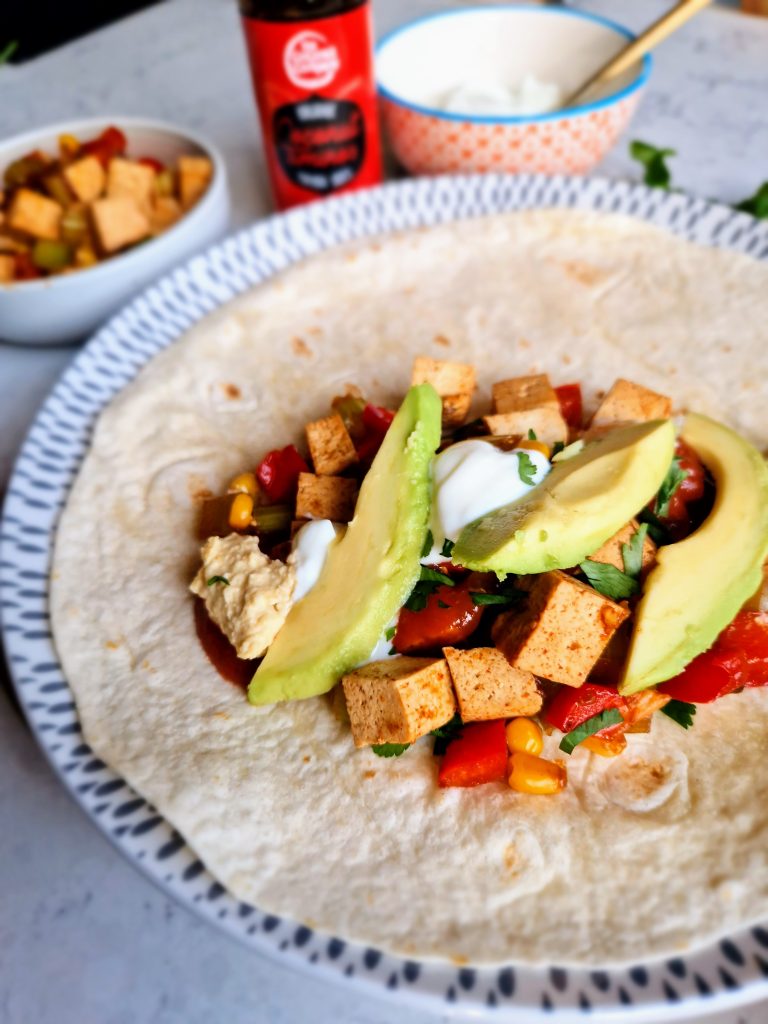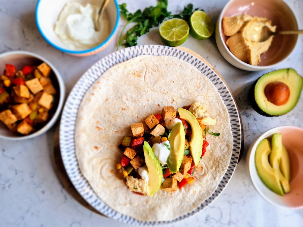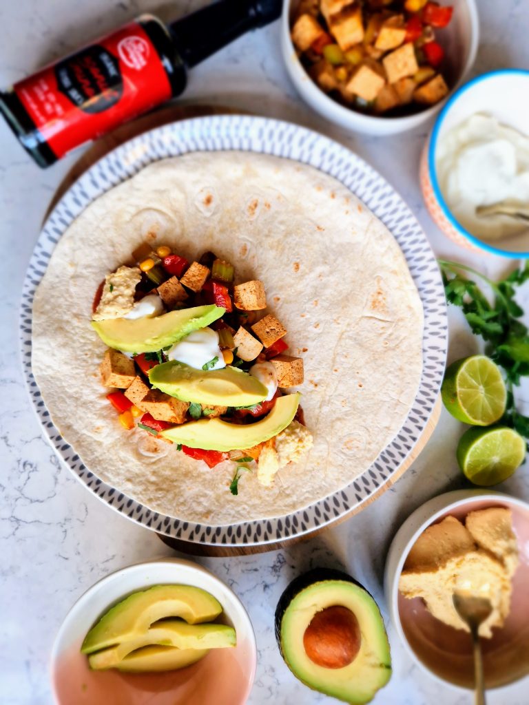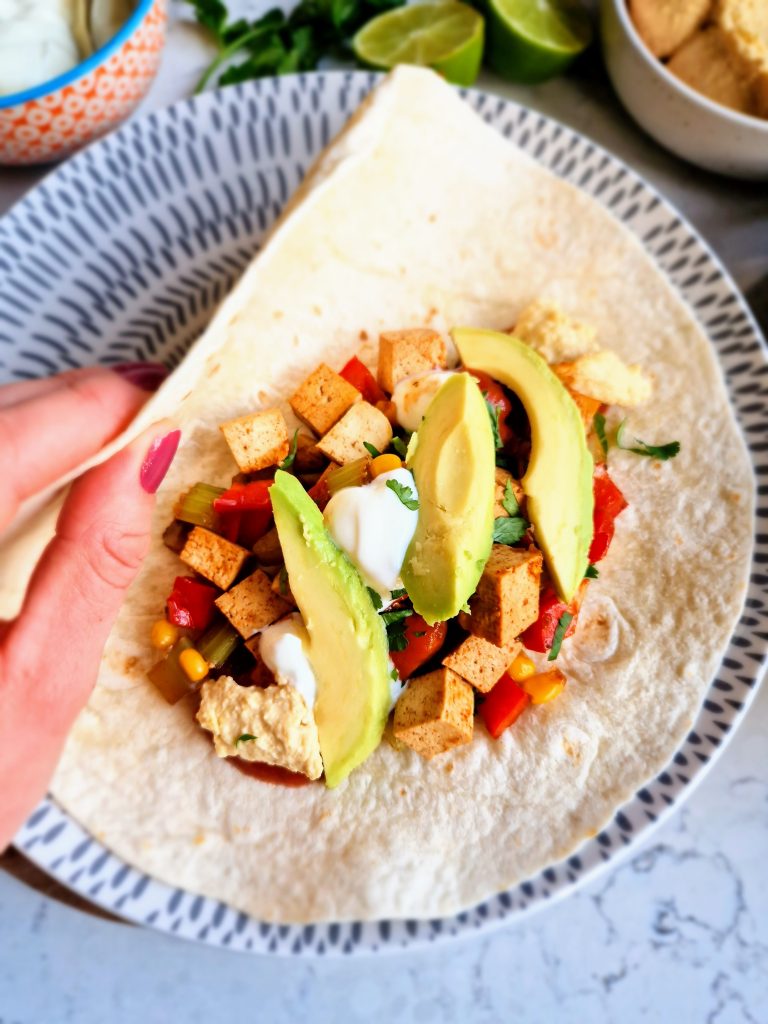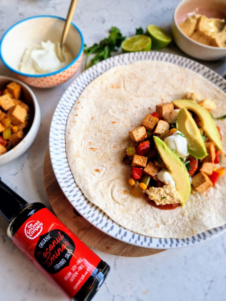 - Warm up the tortilla wraps, then serve out the tofu mixture in the middle of each. Add the extras on top and enjoy!
