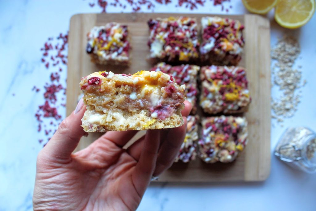 - Bake for 25 minutes until firmed up and golden. Leave to cool in the tin then cut into 9-12 bars. Drizzle over melted white chocolate, sprinkle over lemon zest and freeze-dried raspberries, and enjoy!