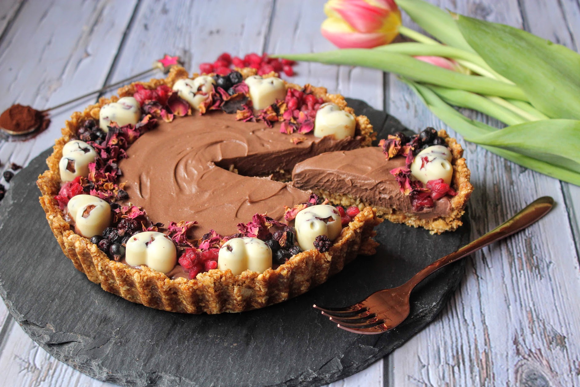 An oaty, nutty tart case filled with a rich, creamy chocolate mousse, topped with homemade white chocolate hearts and berries sprinkled on top…Ahh, an easy …