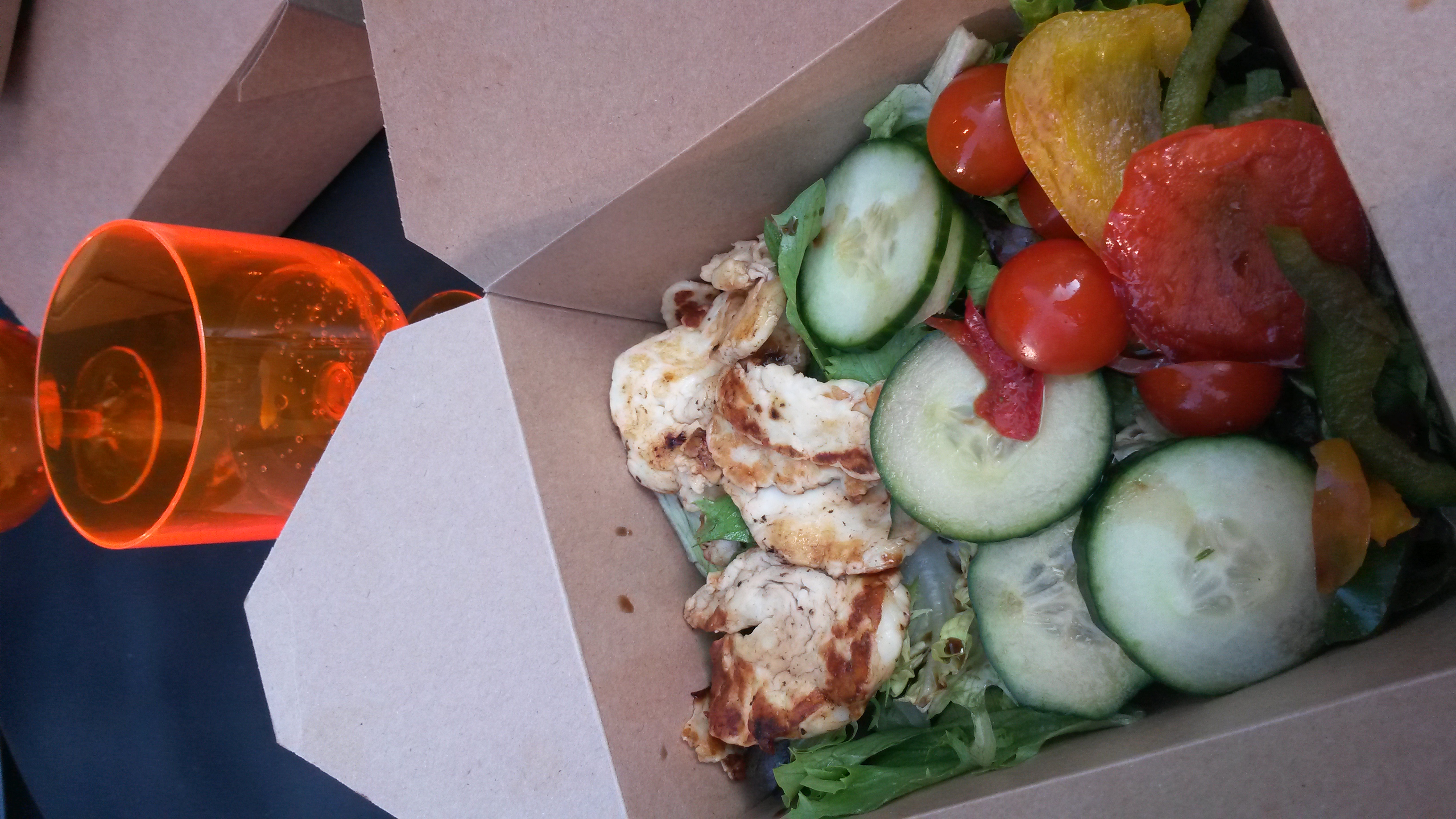 Katie and I headed out onto the terrace with many others to enjoy our food. A big fan of halloumi, I was pleased to see a generous amount mixed in with plenty of fresh green leaves, cucumber, tomato and mixed peppers with a light glaze of balsamic vinegar; perfect, just like something I’d make at home. It seemed from the mass of empty boxes that everyone else was a fan of the food too!