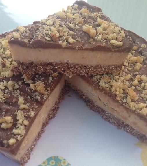 - The next day make the chocolate sauce and pour over the pie. Crush some walnuts and sprinkle on the top. Store pie in the freezer and thaw for 10-15 minutes before eating.