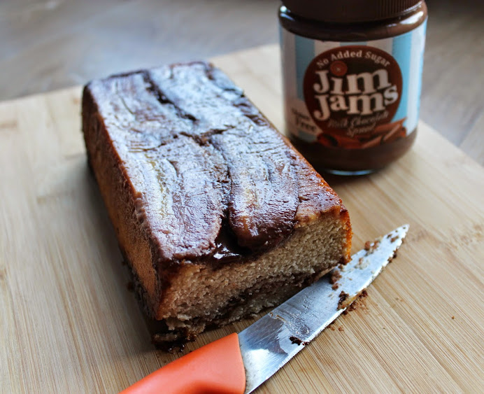 - In a small pan heat the coconut oil and Jim Jams chocolate spread until melted. Spoon in half of the cake mixture, drop in spoonfuls of the chocolate sauce and swirl around, then add the rest of the cake mixture and swirl around again.