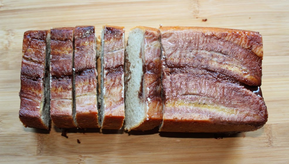 - Grab one banana – the biggest! – and slice in half horizontally, then slice each half again vertically. Place the slices facing flat side down in the tin so it pretty much covers the base in your preferred pattern.
