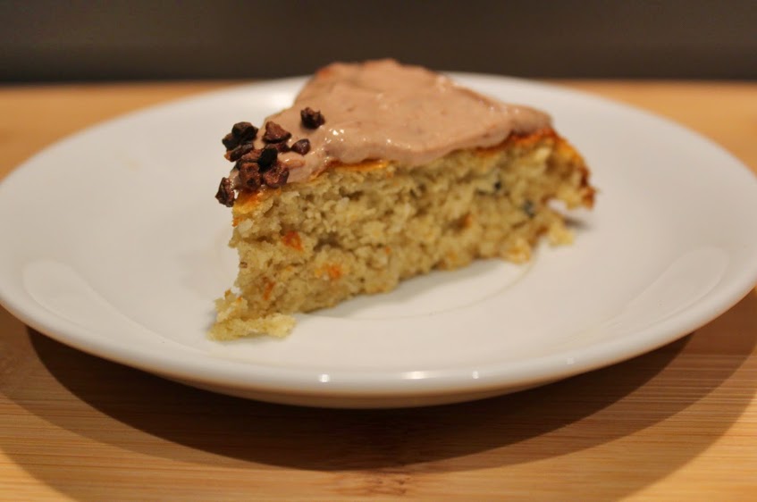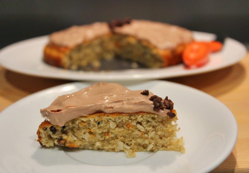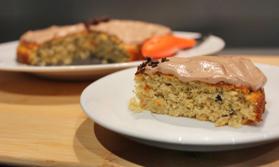 - When you’re ready to serve, remove the cake from the tin and spread the topping evenly over the top. Sprinkle over some cacao nibs and voila, a wonderfully moist, tasty cake to enjoy completely guilt-free!