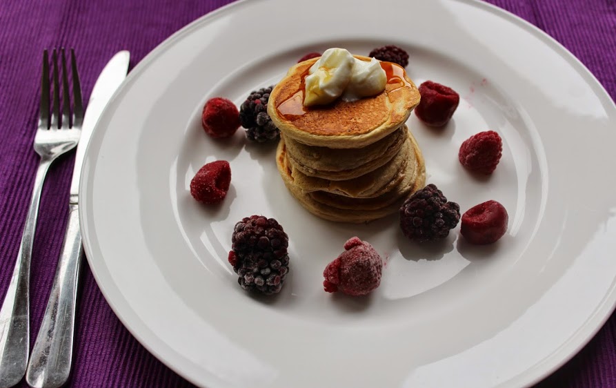 The instructions on the pack were straightforward enough – add 2 scoops (50g) of the mix to water and leave to stand for 2 minutes. Thick with a mousse-like texture, the Maple syrup smell certainly whetted my appetite as I heated a little coconut oil in a pan added two spoonfuls. These cooked easily and after a few minutes, I flipped them over for a few more until cooked through, then repeated to create about six mini ones, stacked on top of each other.
