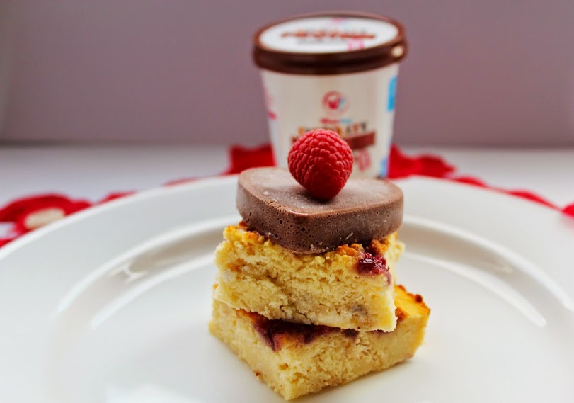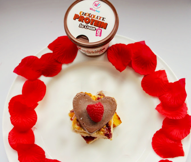 Chocolate, raspberries and cake – the food of love. With it being Valentine’s Day today, this dessert recipe is ideal for lovebirds looking for a protein-packed, healthy and indulgent treat that doesn’t have to be drastically naughty; save that for other things. Rippled, fruity squares of sweet ,moist sponge served with frozen Wheyhey protein ice cream chocolate hearts not only look pretty but really will impress the other half when you tell them it’s guilt-free too!