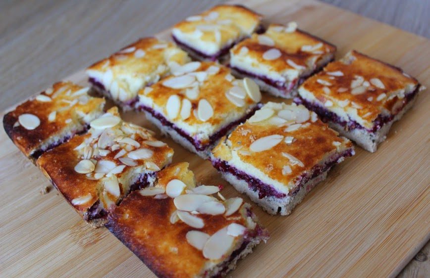 Once you have spread the jam over the cooked base, smooth this over the top, scatter over the flaked almonds if using) and bake for 20-25 minutes (you made to cover it with tin foil so it doesn’t burn!). Remove from oven and leave to cool.