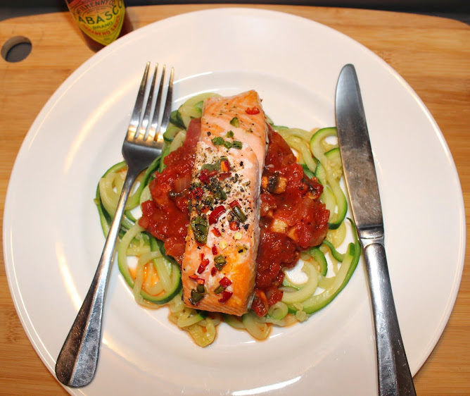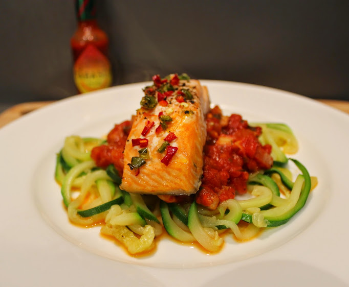 Spicy Tabasco Salmon with Courgetti Noodles & Tomato Sauce