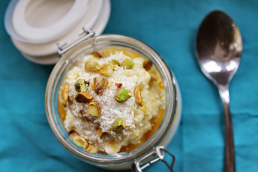 - Dessicated coconut and toasted pistachio pieces, to serve