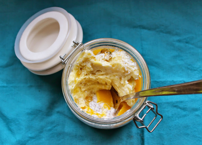 - Spoon on top of the mango, sprinkle with dessicated coconut and pistachio pieces and there you go, a tropical taste of heaven in a glass!