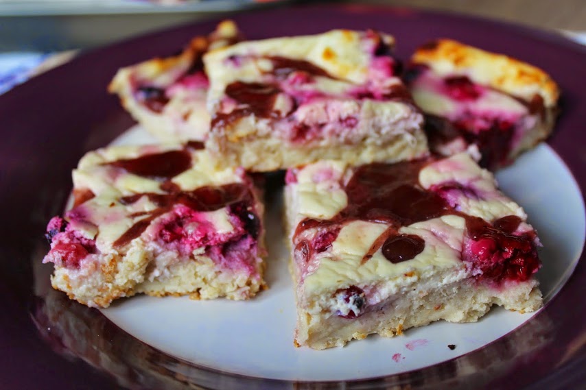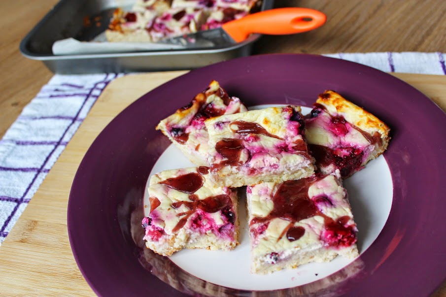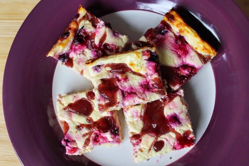 - Now make the cheesecake topping. Whisk together the yogurt, vanilla and egg until smooth. Scatter the berries evenly over the base, then spoon over the yogurt mixture, ensuring most of the base is covered.