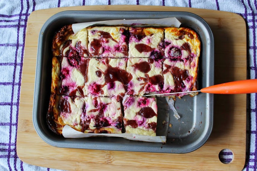 - Bake in the oven for about 30-35 minutes, until set and golden – don’t worry if it feels a little soft, as it will set. Remove from oven and leave to cool, then chill in the fridge for a few hours.