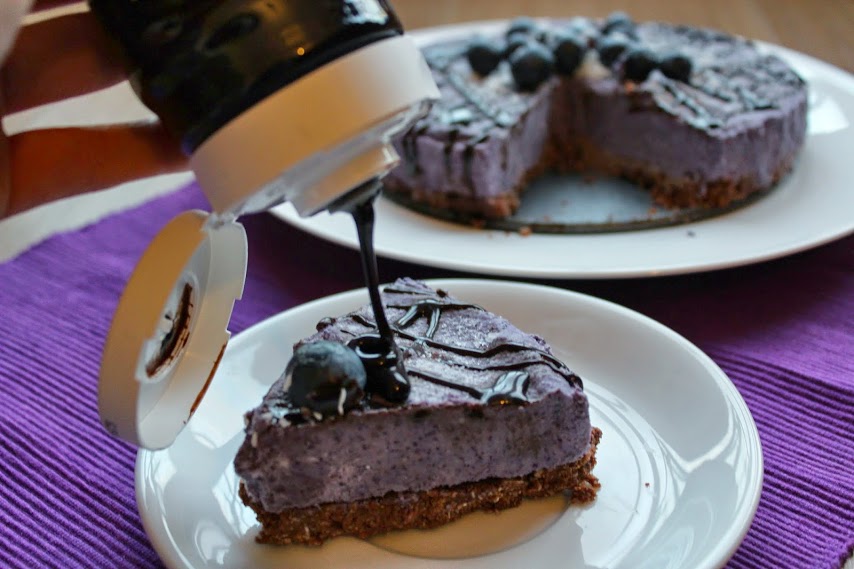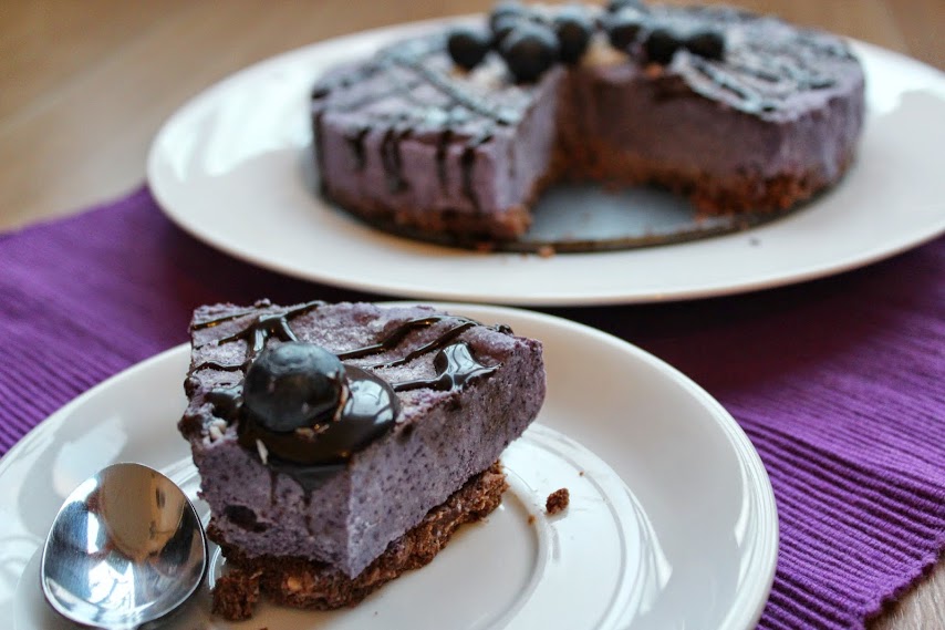 While your base is in the freezer, make the filling. Simply drain your cashews, then add to high power blender with the remaining ingredients. Blitz up for a few minutes (it might take a few stop and starts!) until you have a smooth, creamy and vibrant purple colour mixture. Spread this on top of your base and return to the freezer for at least 4 hours.