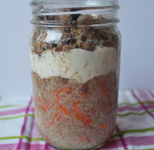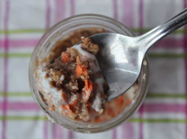 Spoon the cooled, cooked quinoa into a jar and stir in the carrots, mixed spice and protein powder. Now pour in the vanilla extract, syrup and milk and stir well until you have a thick, porridge-like consistency. Add the yogurt on top and leave in the fridge.