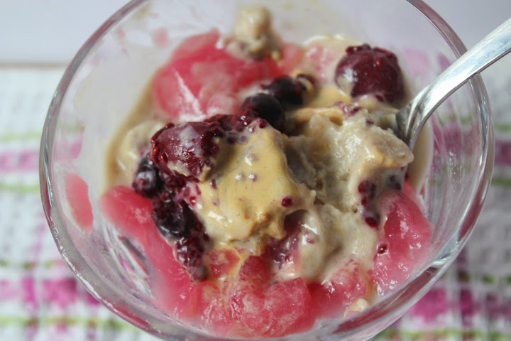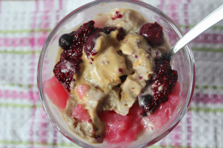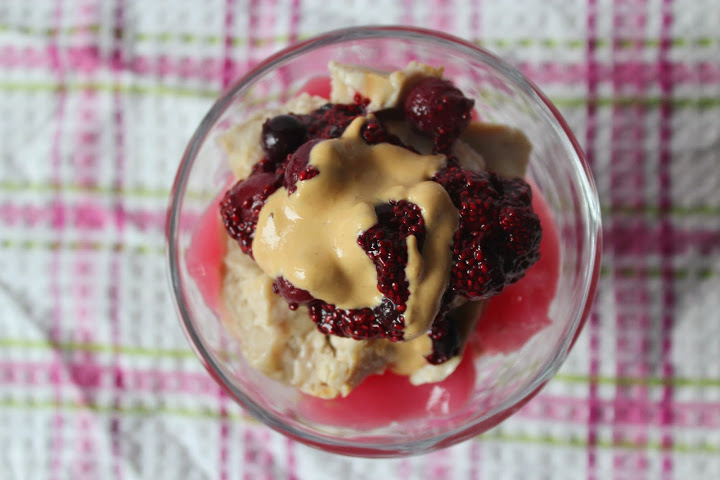 It’s totally up to you which order you want, but I went for jelly at the bottom, some of the peanut vanilla ice cream then berry chia jam on top…and even made a little more PPB mixed with water for a sauce…Now get #IndulgingInnocently!