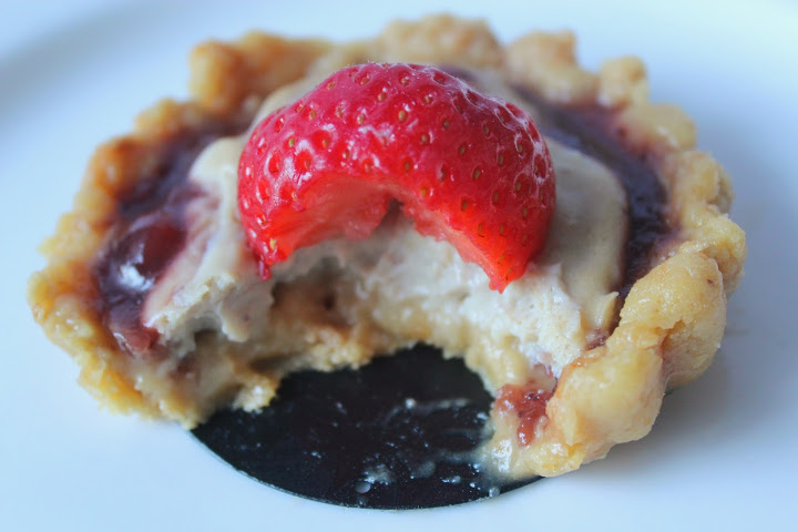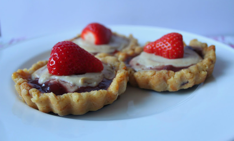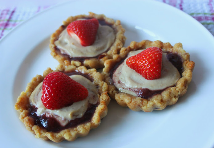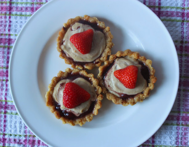 Ready to serve? Remove the tartlet tins from the fridge and gently loosen from the tins. Add a spoonful of the chilled tofu mixture, then a teaspoon of the jam. Top with another spoonful of the tofu to fill, then stir a little and add a fresh strawberry half to decorate. Now serve and enjoy!