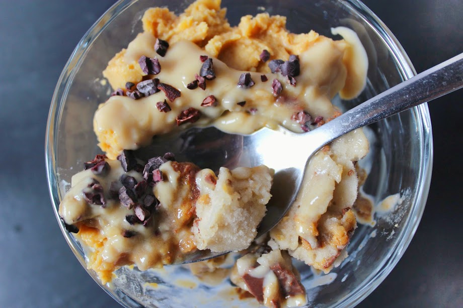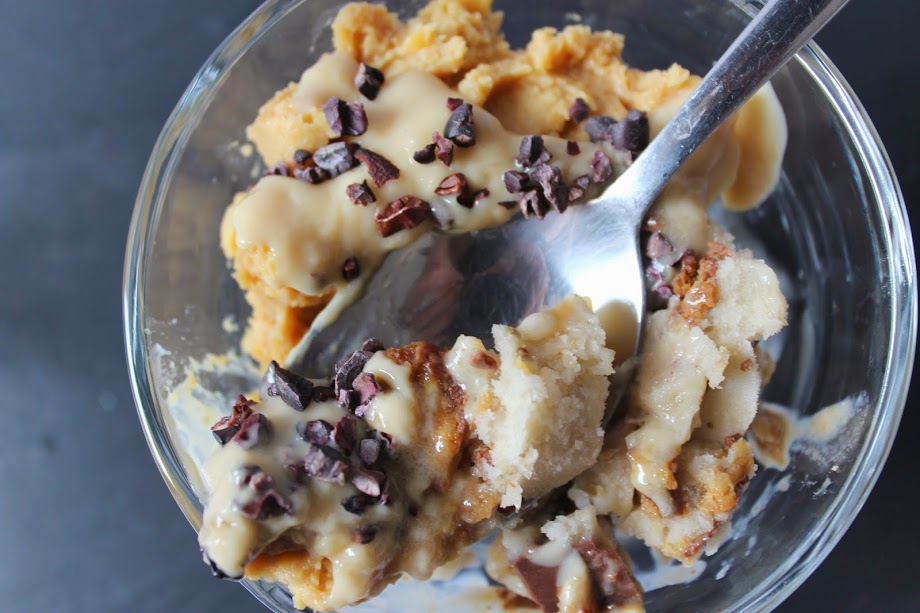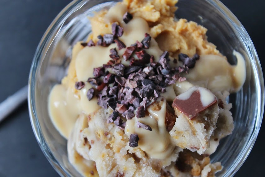 Ready to serve? While your caramel sauce is still warm, remove the nana ice cream from the freezer 5 minutes beforehand. Spoon some of the cookie dough into a bowl or sundae dish, scoop over some of the ice cream, then pour over some of the sauce and sprinkle over cacao nibs. DEVOUR!