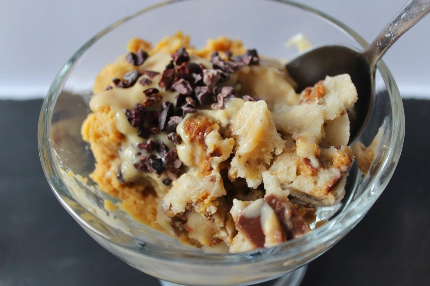 A protein packed vanilla cookie dough, nana ‘ice cream’ with caramel crunch pieces using PhD Woman Caramel Crunch bars and a coconut caramel sauce, this dessert or bedtime snack epitomises comfort food. Sorry if this recipe gets addictive 🙂