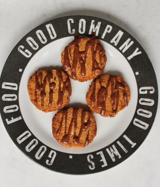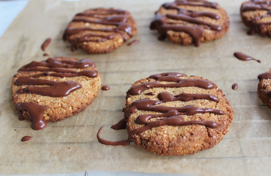 - Whisk together the date nectar and cacao powder so you have a smooth, glossy sauce, then drizzle over each cookie.