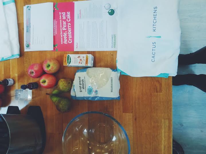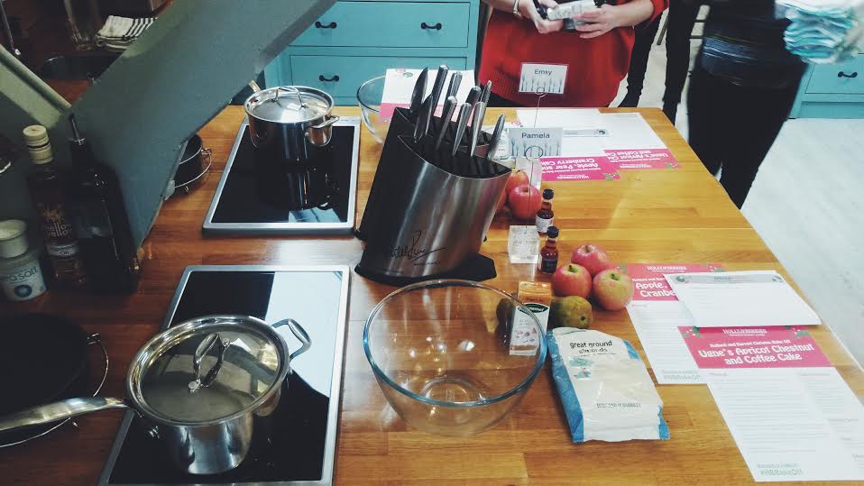 Enough fan girling. Set at our cute little work stations, we were ready for our Christmas baking challenge: we had one hour to re-create a dairy, wheat and gluten-free low sugar Apple Pear & Cranberry Cake, all following the same recipe.