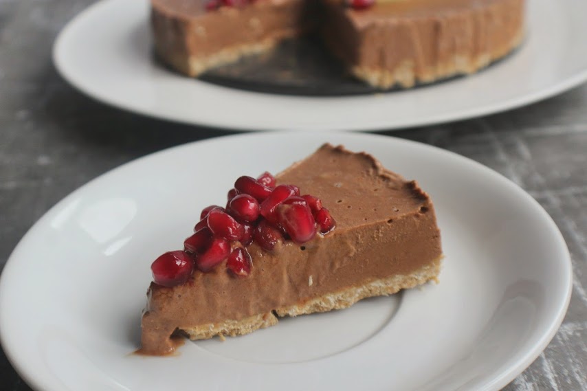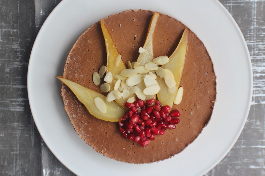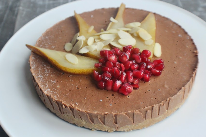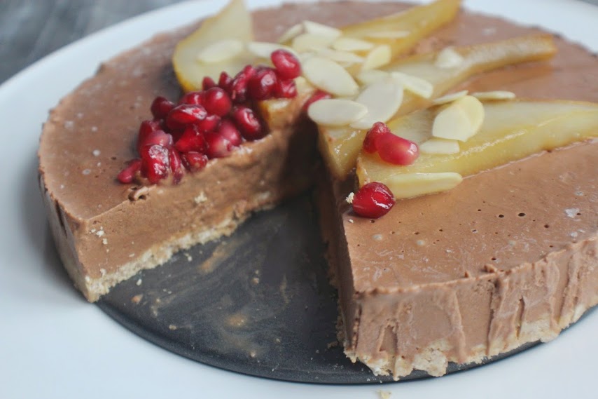 When you’re ready to serve, remove the cheesecake from the freezer at least 10-15 minutes beforehand to defrost a little. Remove from the tin, arrange the pear slices and pomegranate seeds on top and sprinkle with flaked almonds. Now slice up and serve!