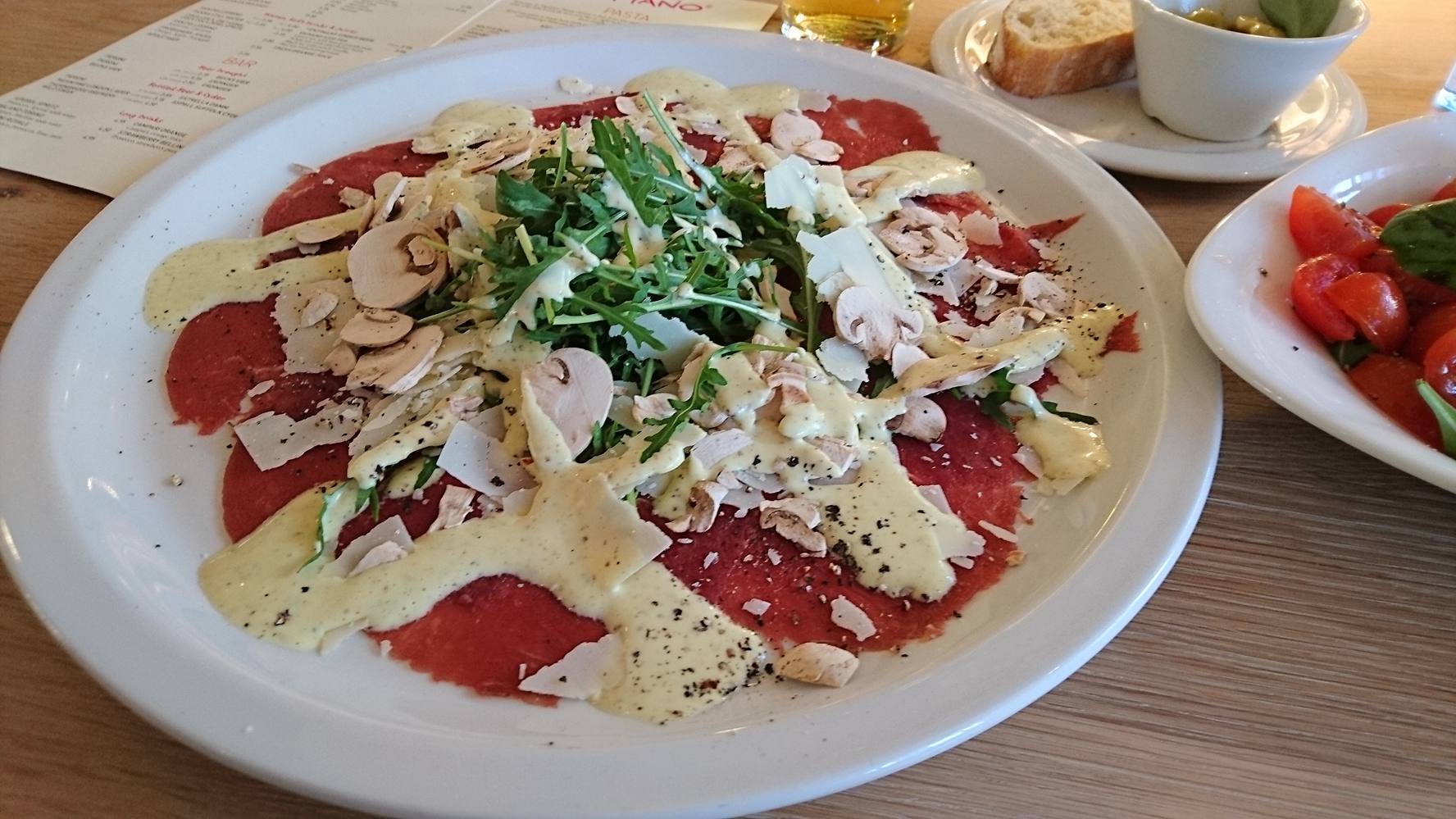 Onto the food – and this is where Vapiano wins. For starters, the Insalata Caprese, a classic, simple concoction of tomatoes, mozzarella and fresh basil, was executed so well it was transformed into a generous, juicy dish. Meanwhile James chose something he’d never tried: the Carpaccio, a huge plate decorated with finely sliced beef fillet, a tangy cipriana sauce, a scattering of mushrooms and finished with rocket and Grana Padano. Utter perfection.