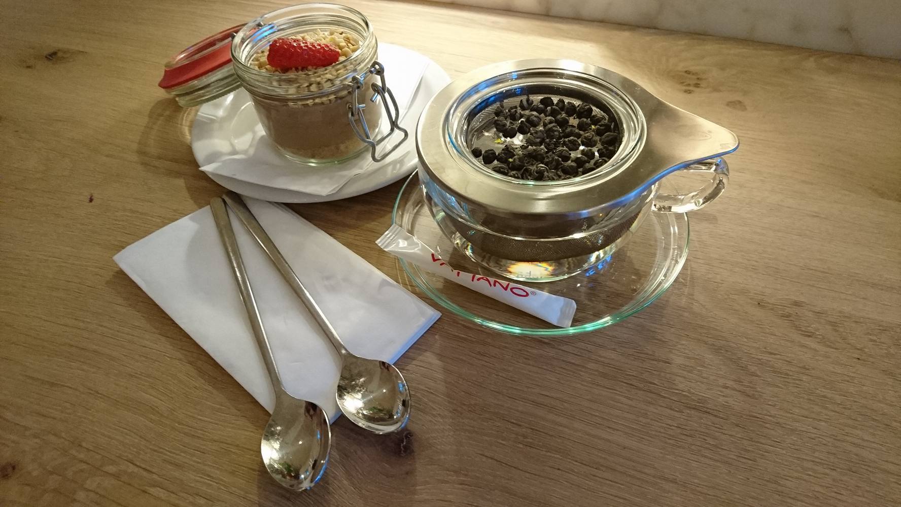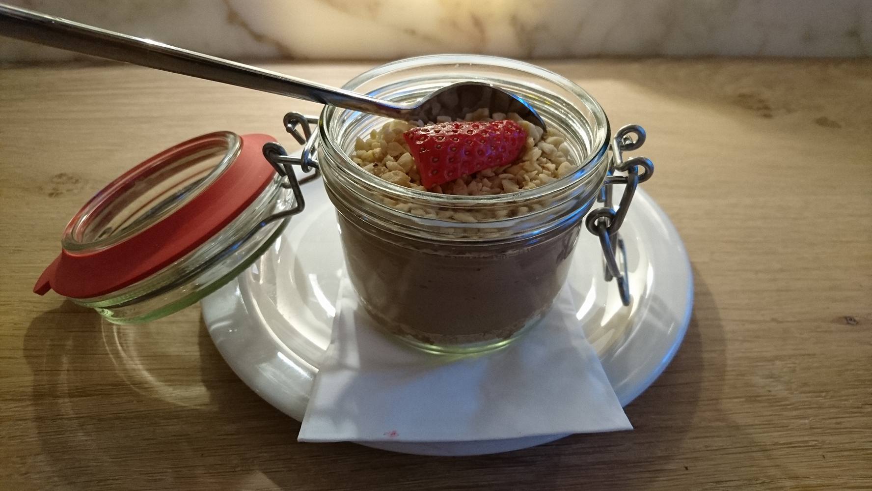 Too full for anything else, a refreshing loose-leaf Jasmine tea finished off the evening perfectly, while James caved in and asked our waitress what she would recommend for dessert (it’s all about balance, right?). The Barcio, chocolate and hazelnut blended on a biscuit base, topped with hazelnuts. Of course I had a taste (minus the biscuit)…Holy sh*t it was orgasmic, like a Ferrero Rocher mousse in a cute kilner jar. James was in love – he has even challenged me to try and re-create a healthier version of this dessert, so game on!
