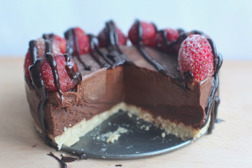 Tip the whizzed up oats in a bowl then stir together with the protein powder/almond flour. Pour in the melted coconut oil, chosen syrup and vanilla and mix together to form a dough – you might want to add a dash of almond milk or water if a little too dry. Now press into a mini loose-bottomed cake in and smooth out evenly. Keep chilled.