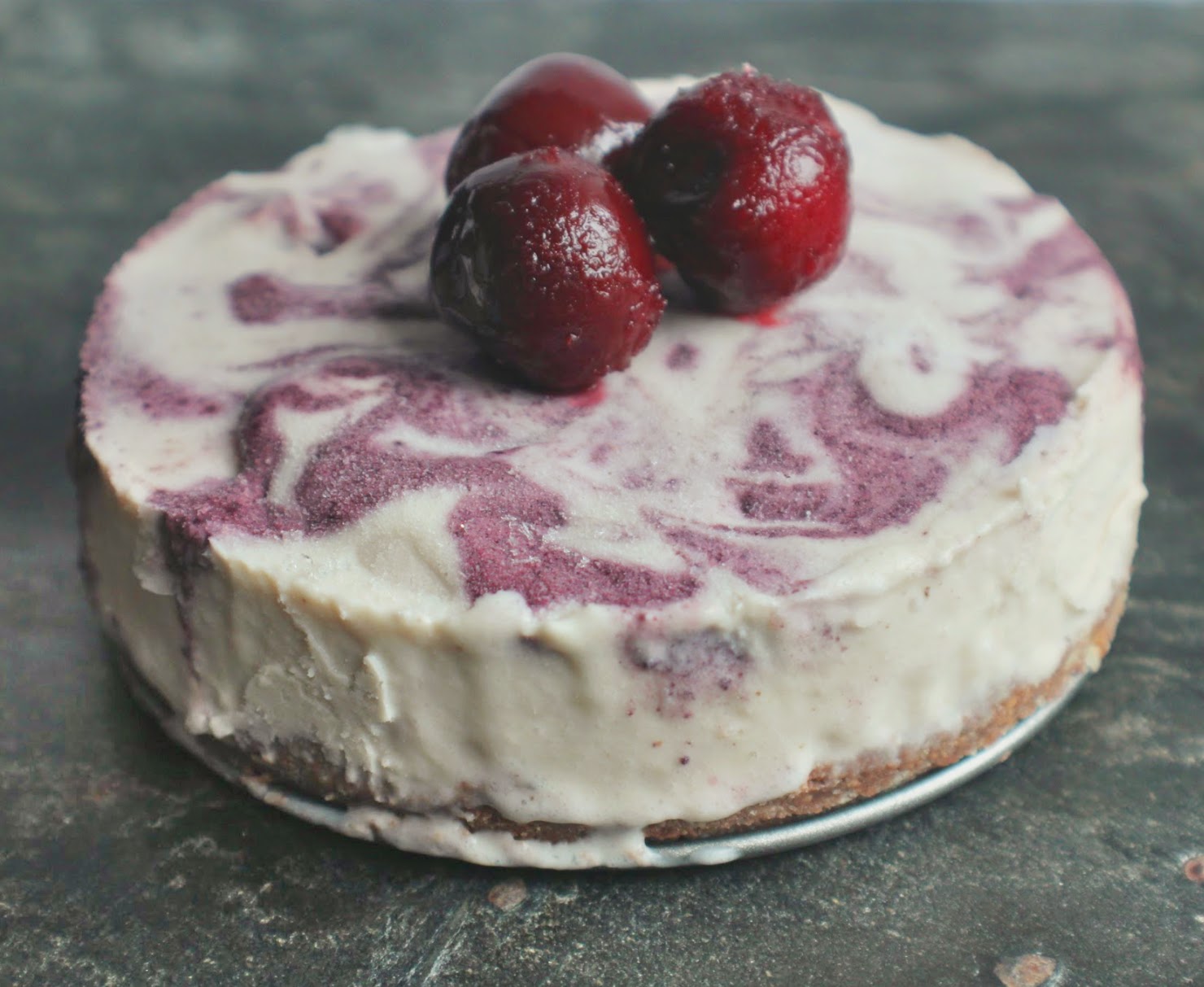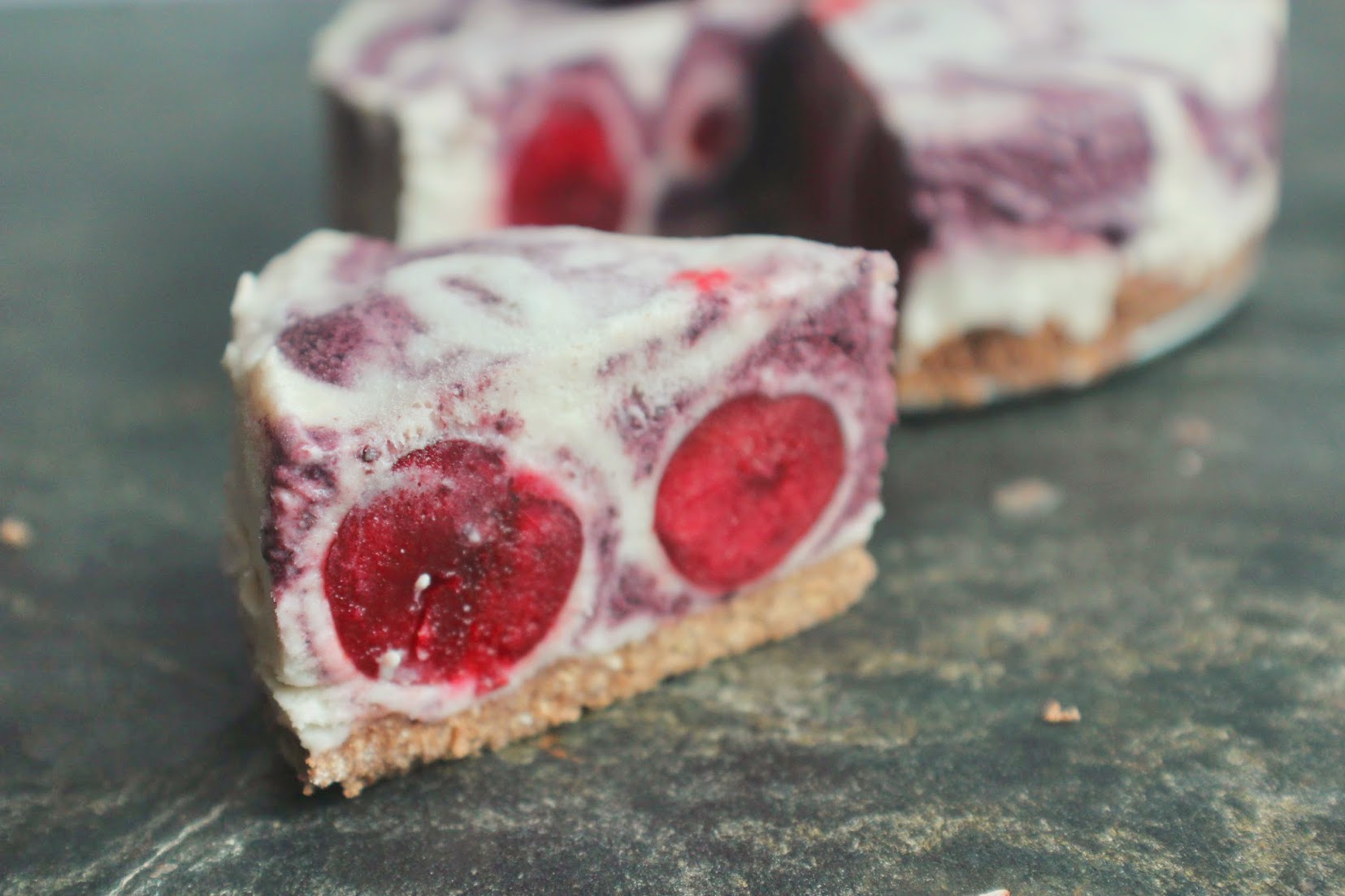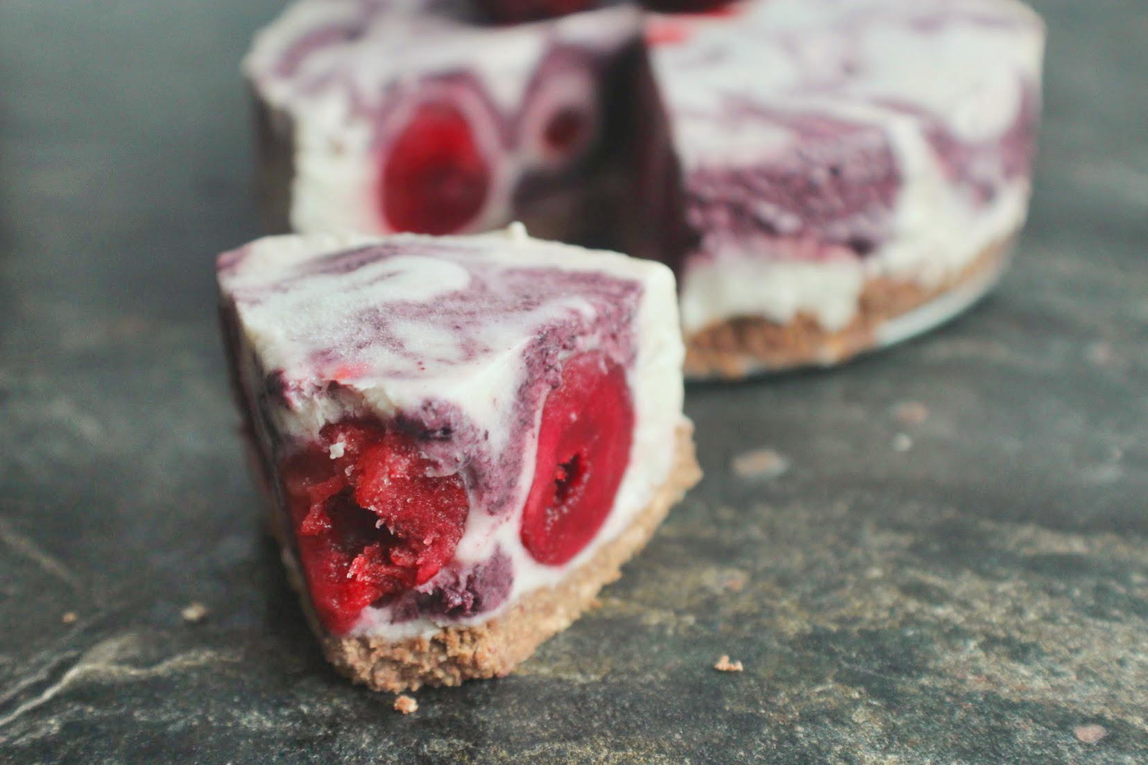 Mix the frozen cherries into the non-acai berry mixture and pour onto the base of the cheesecake. Now drizzle over the acai part and swirl in to create a marble effect. Freeze for at least 4 hours.