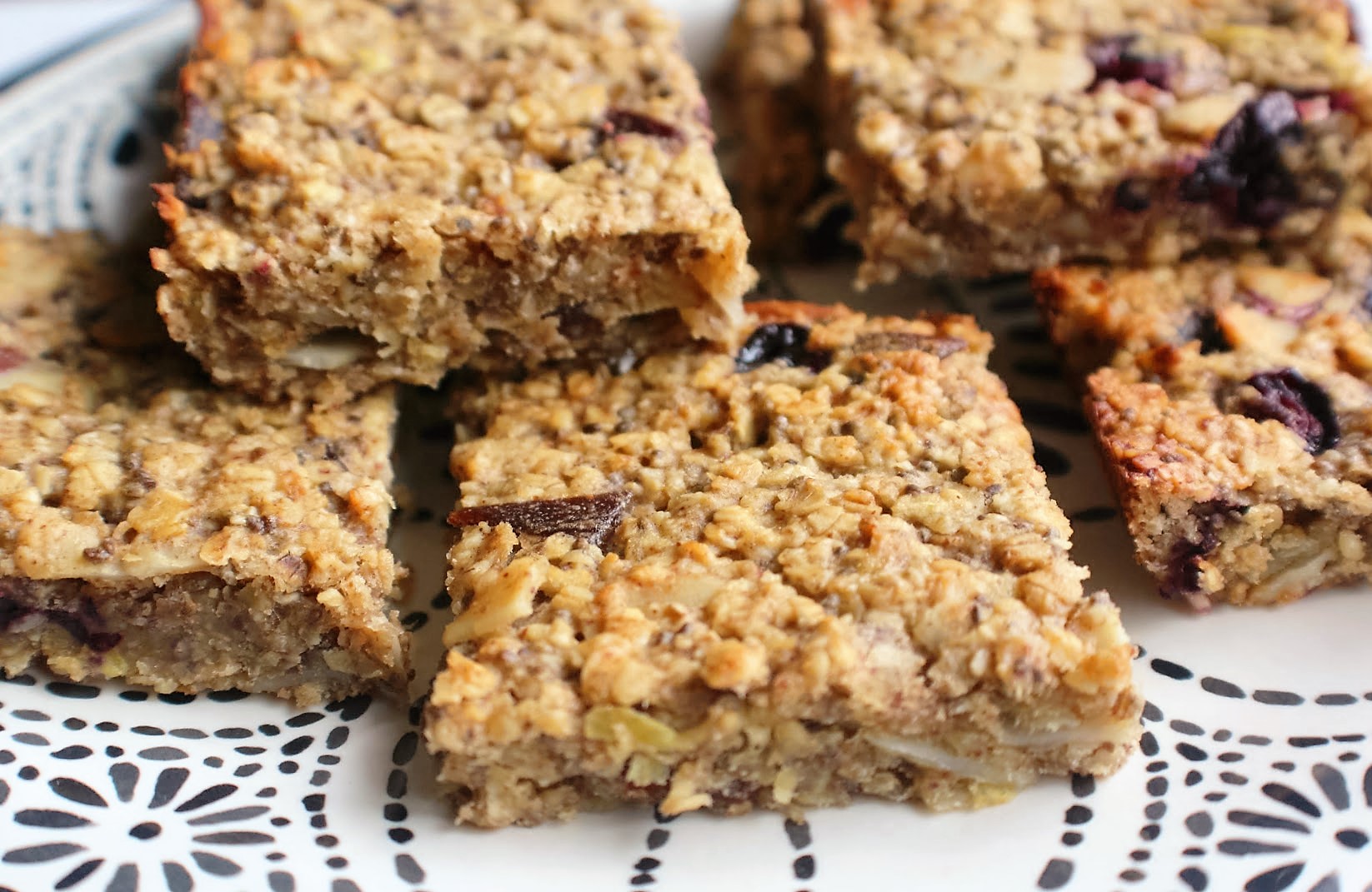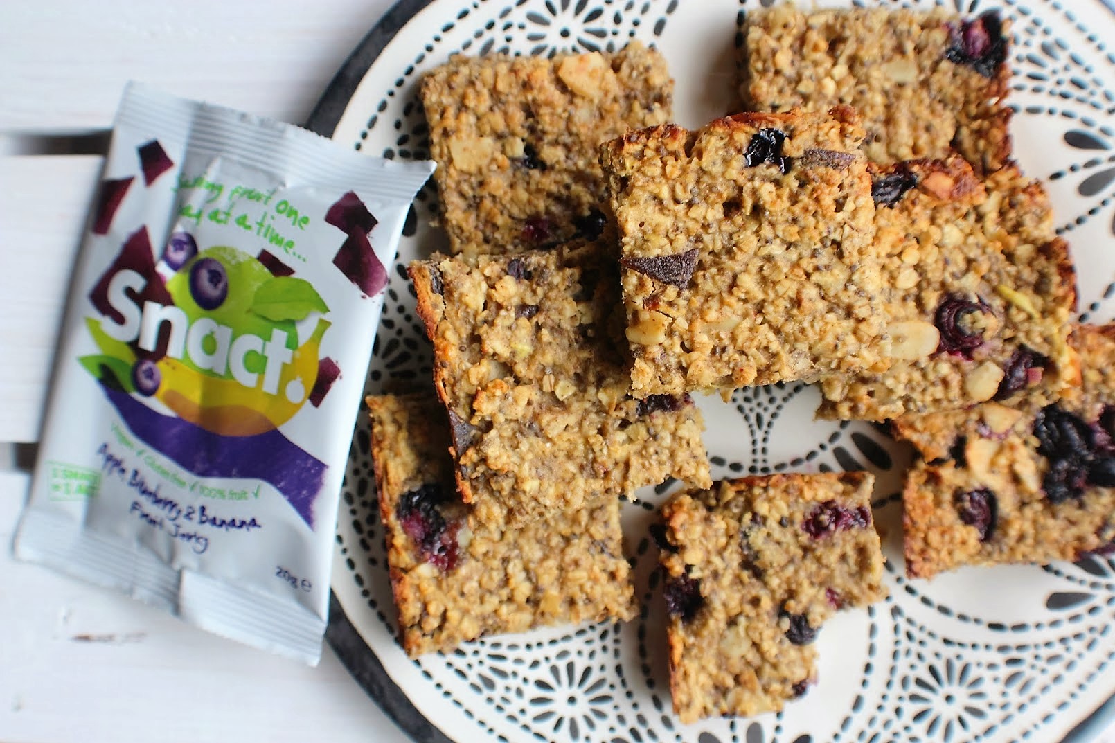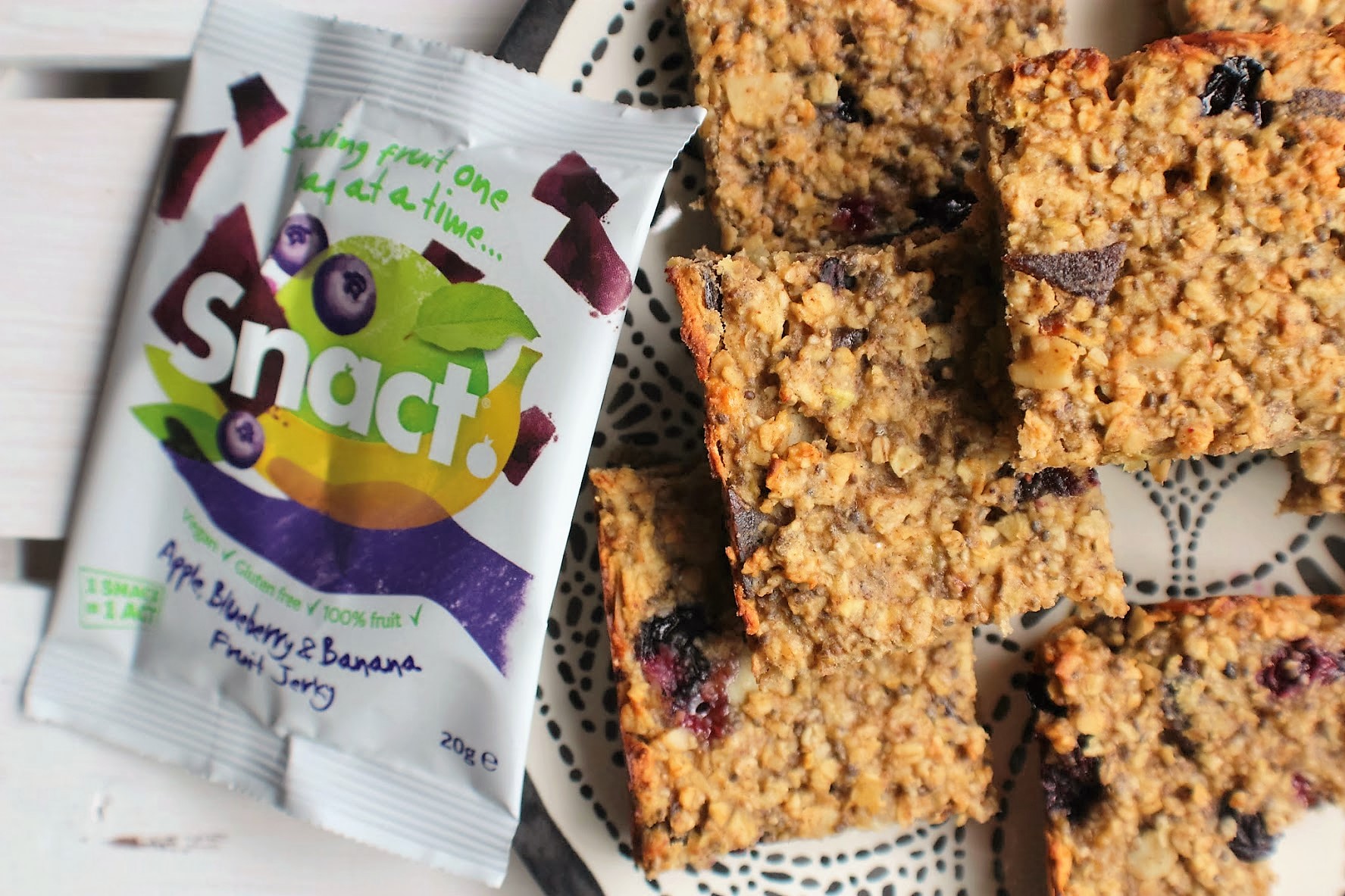 I’m delighted to be working with the brand on some recipe development using these fruity goodies, so without further ado, here’s the first one: A high-energy bar bursting with natural goodness, healthy ingredients and flavour using the Apple, Blueberry & Banana jerky, making an ideal breakfast on-the-go or pre/post workout boost.