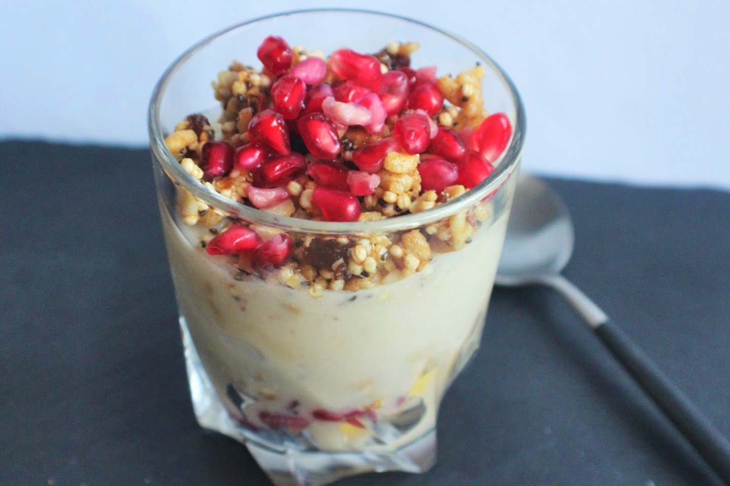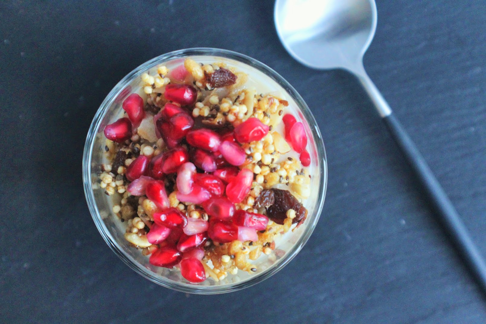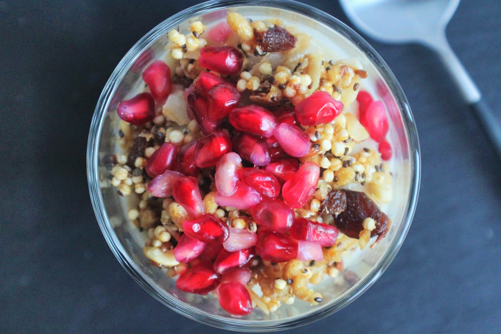 - Top with extra pomegranate seeds, then the remaining broken-up Perkier bar. Now tuck in!