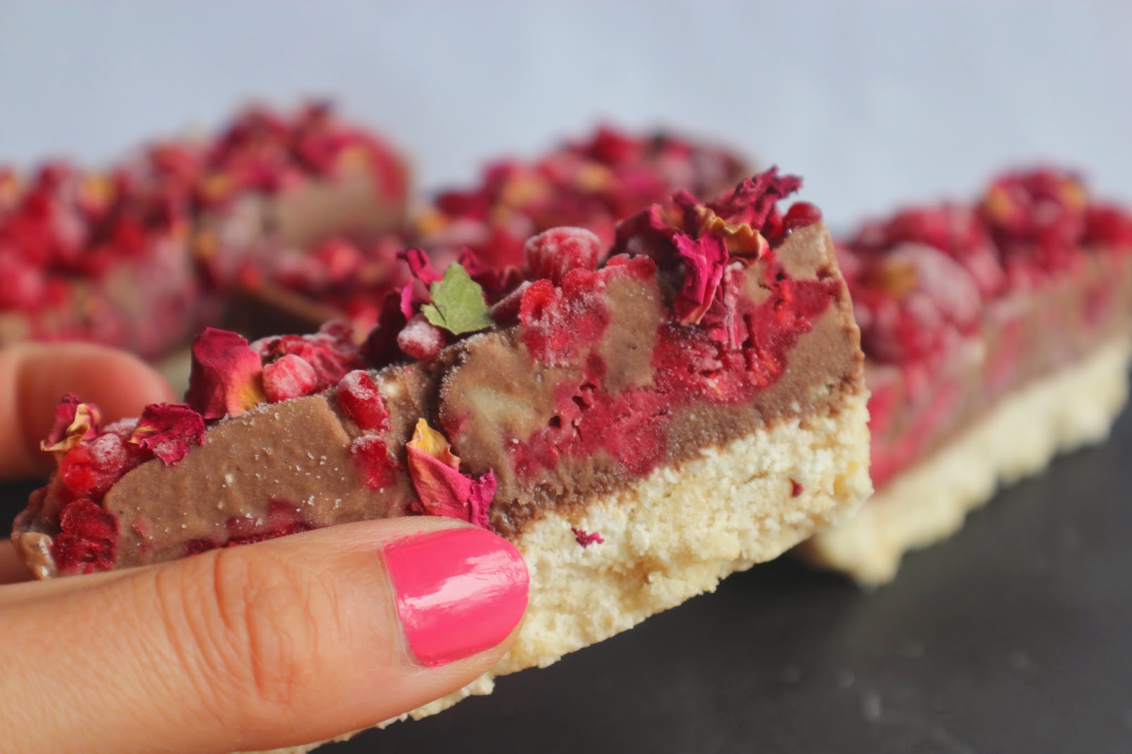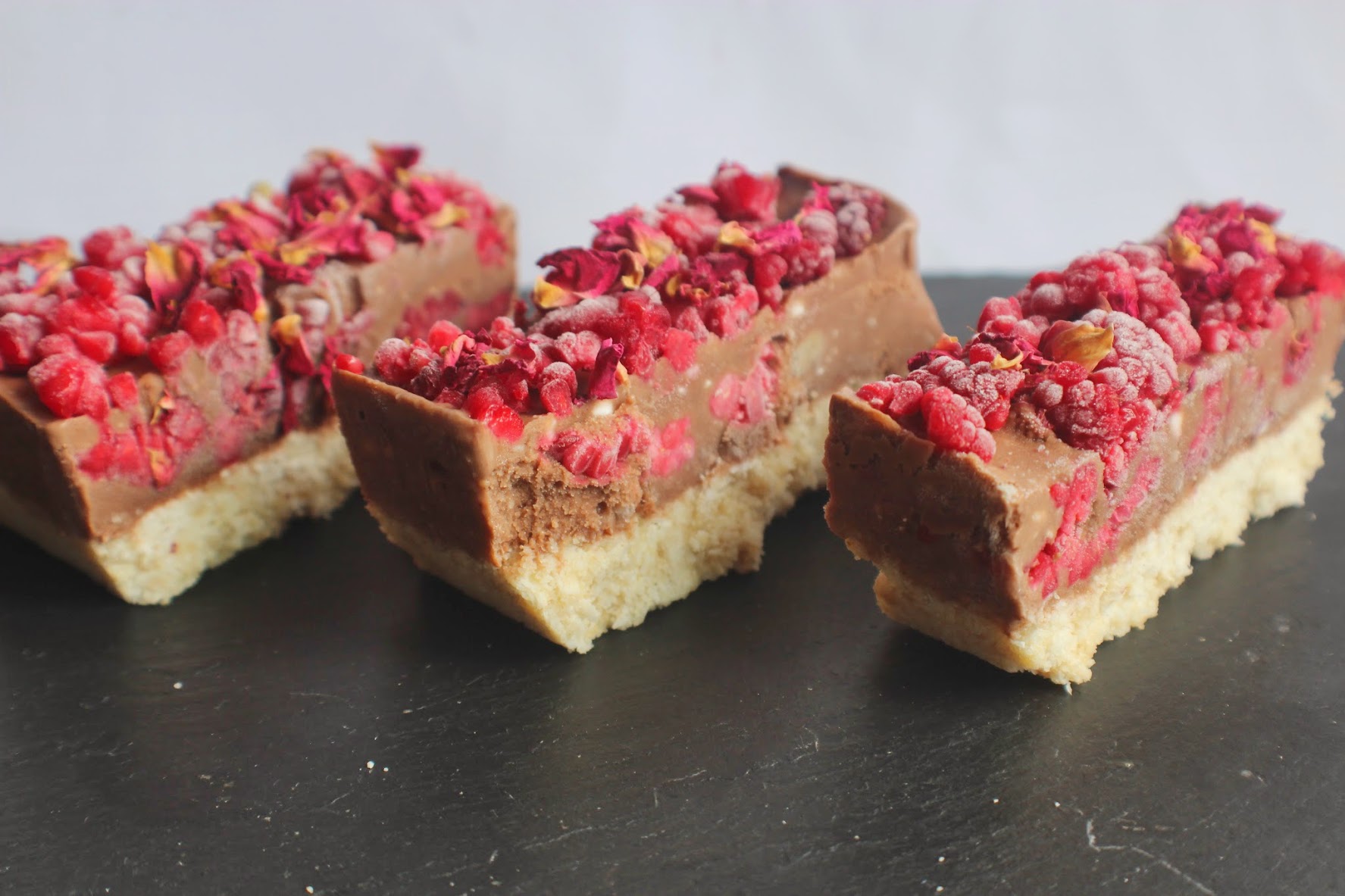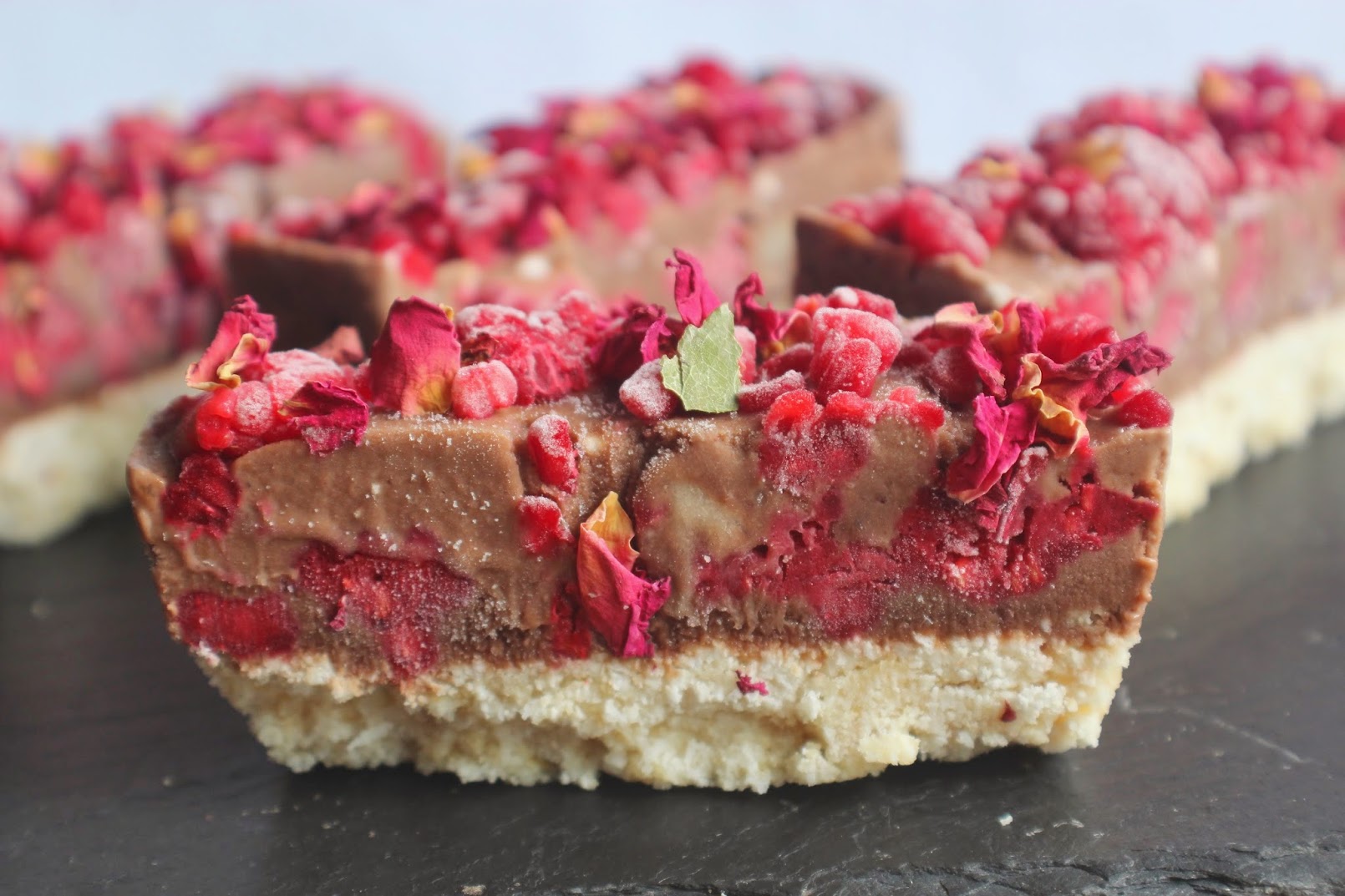 - Pour half of the mixture over the base, then scatter over half the raspberries to cover in one layer. Now pour over the rest of the ice cream mixture and scatter the rest of the raspberries over, along with the dried rose petals.